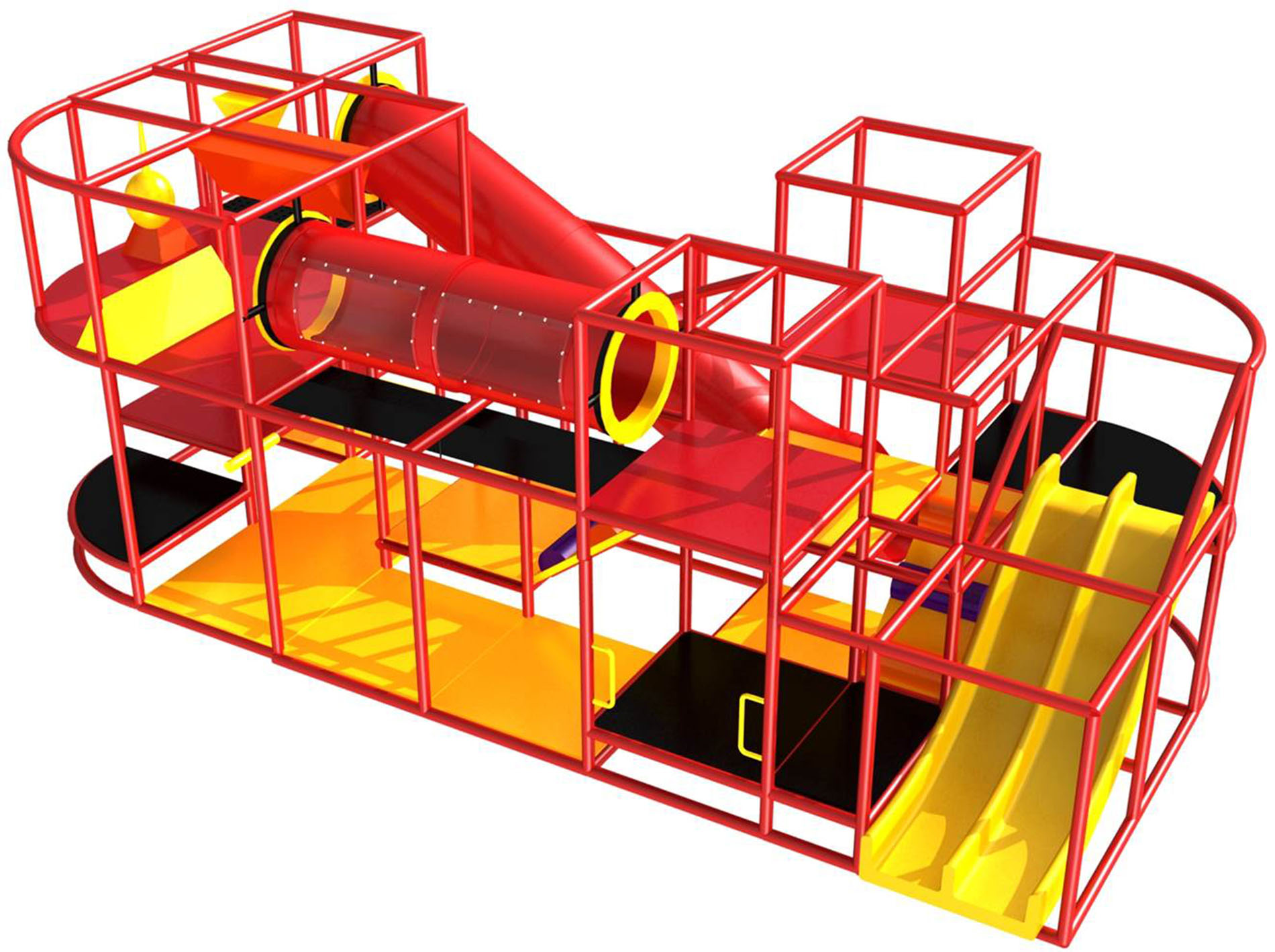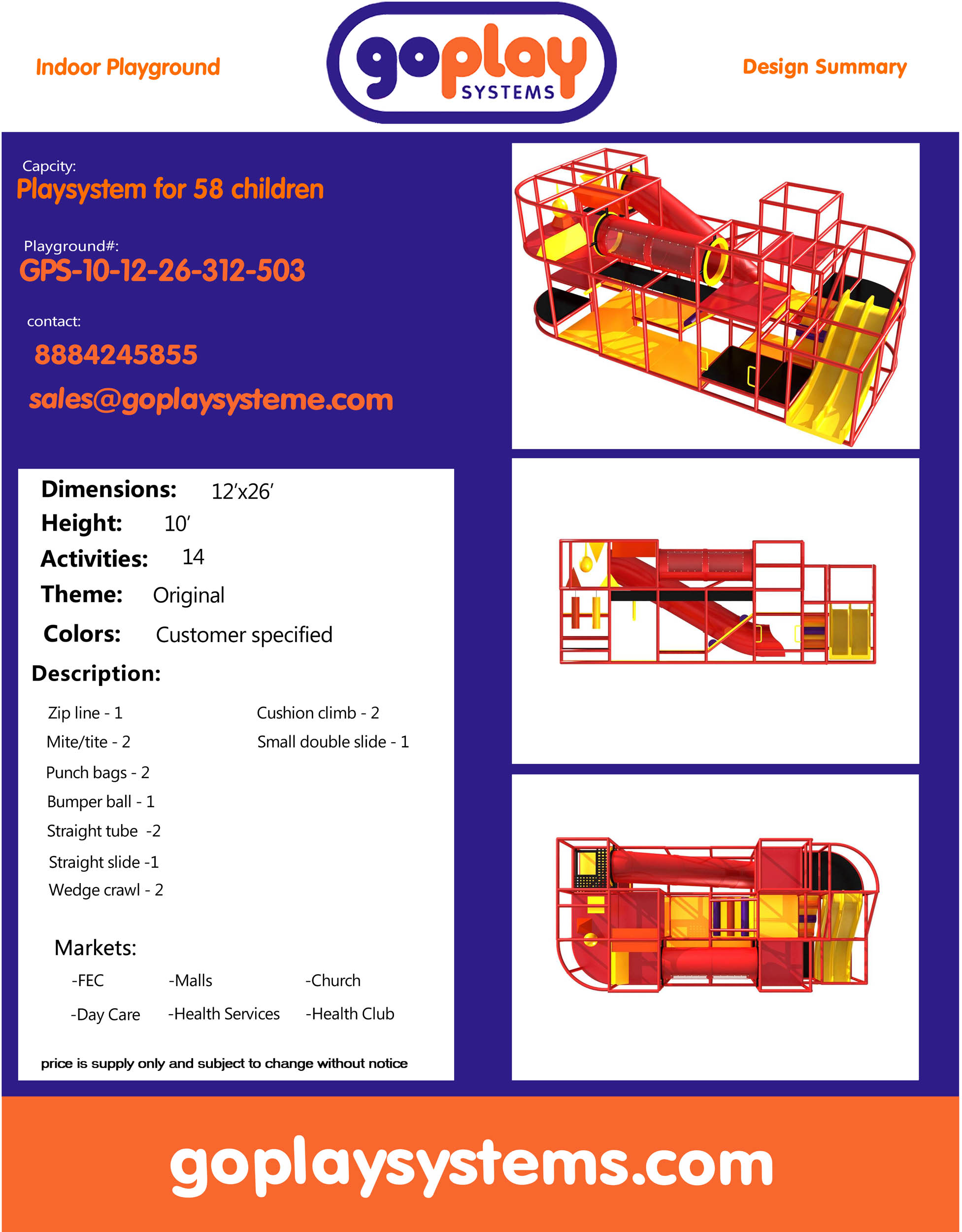Indoor Playground GPS503 is a custom indoor playsystem for children three to twelve years of age. The softplay unit measures 12 ft. wide by 10 ft. high and a length of 26 ft. The minimum room space required for this children’s play equipment is approximately 18 ft. room width with a 12 ft. ceiling and 32 ft. room length. Small Size Indoor Playground.
