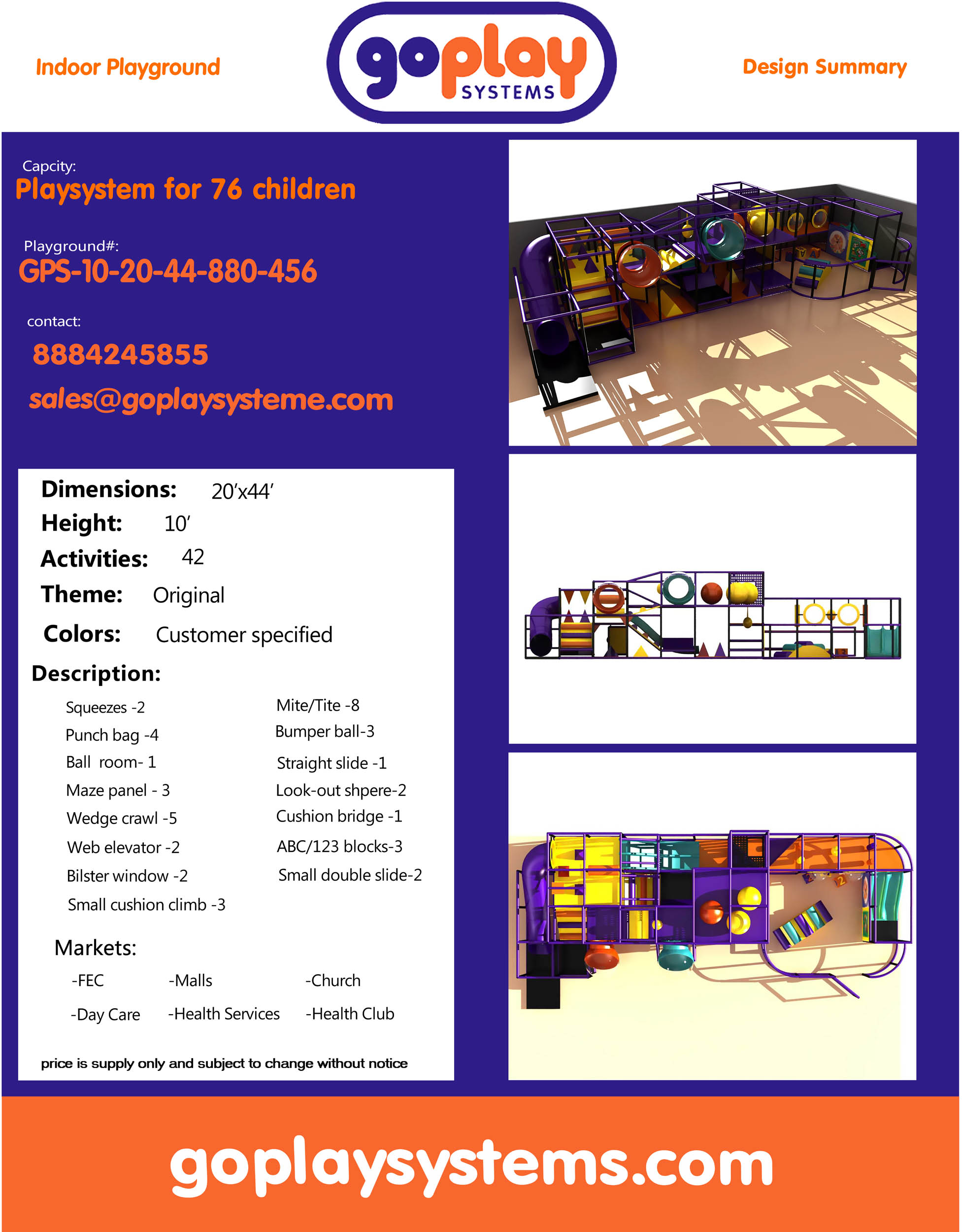 Indoor Playground GPS456 is a custom indoor playsystem for children three to twelve years of age. The softplay unit measures 20 ft. wide by 10 ft. high and a length of 44 ft. The minimum room space required for this children’s play equipment is approximately 26 ft. room width with a 12 ft. ceiling and 50 ft. room length. Small Size Indoor Playground.