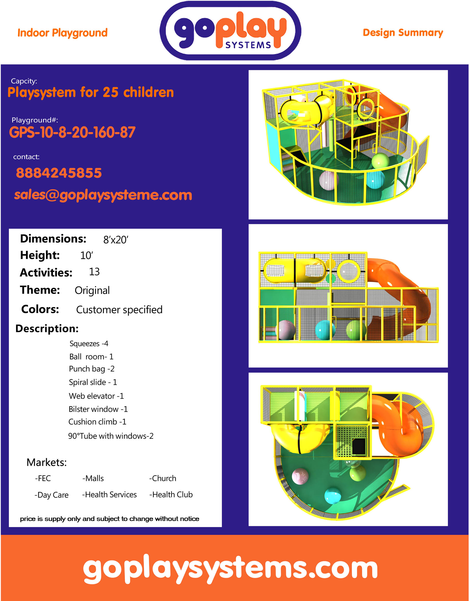 Indoor Playground GPS87 is a custom indoor playsystem for children three to twelve years of age. The softplay unit measures 8 ft. wide by 10 ft. high and a length of 20 ft. The minimum room space required for this children’s play equipment is approximately 14 ft. room width with a 12 ft. ceiling and 26 ft. room length. Small Size Indoor Playground.