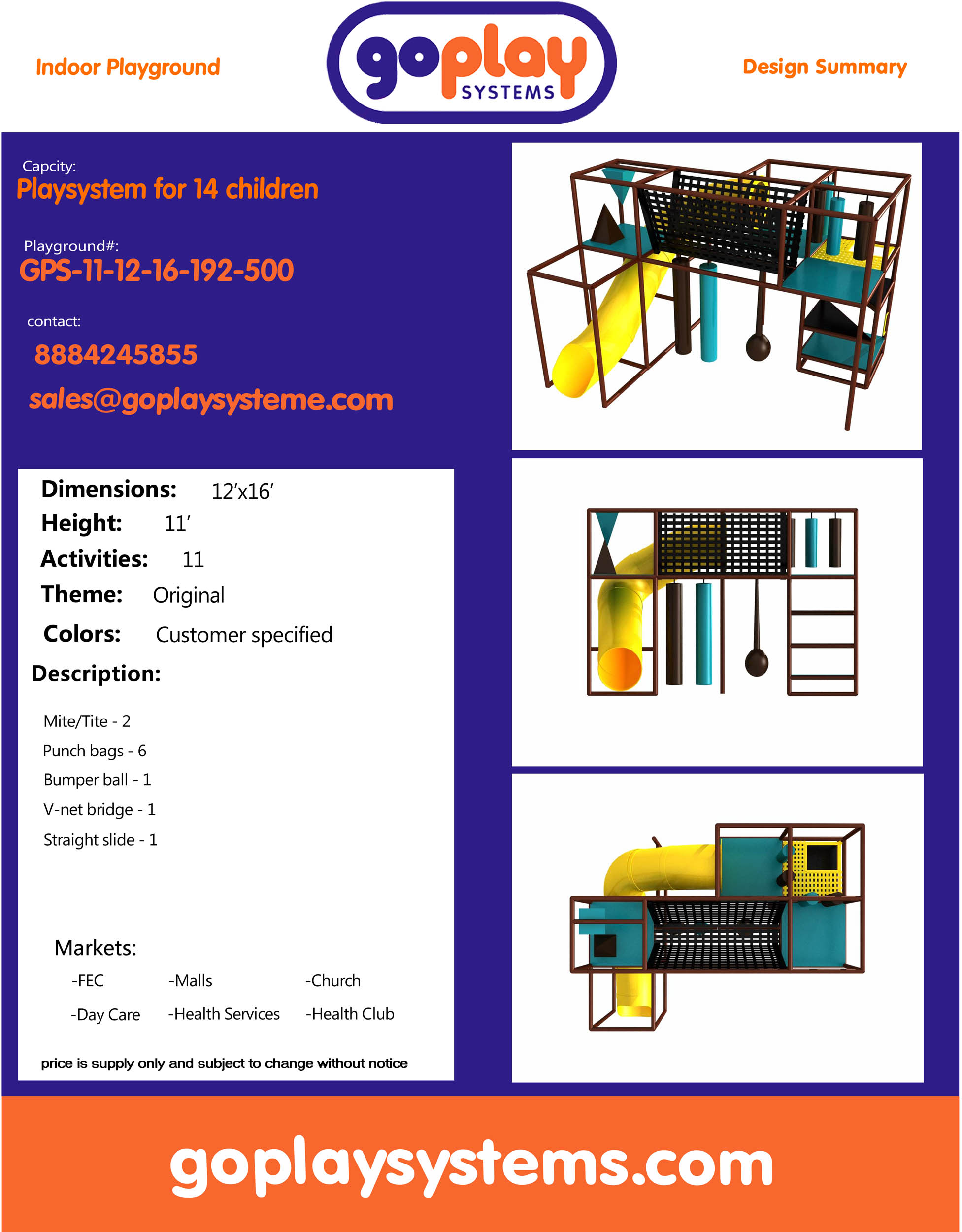 Indoor Playground GPS500 is a custom indoor playsystem for children three to twelve years of age. The softplay unit measures 12 ft. wide by 11 ft. high and a length of 16 ft. The minimum room space required for this children’s play equipment is approximately 18 ft. room width with a 13 ft. ceiling and 22 ft. room length. Medium Size Indoor Playground.