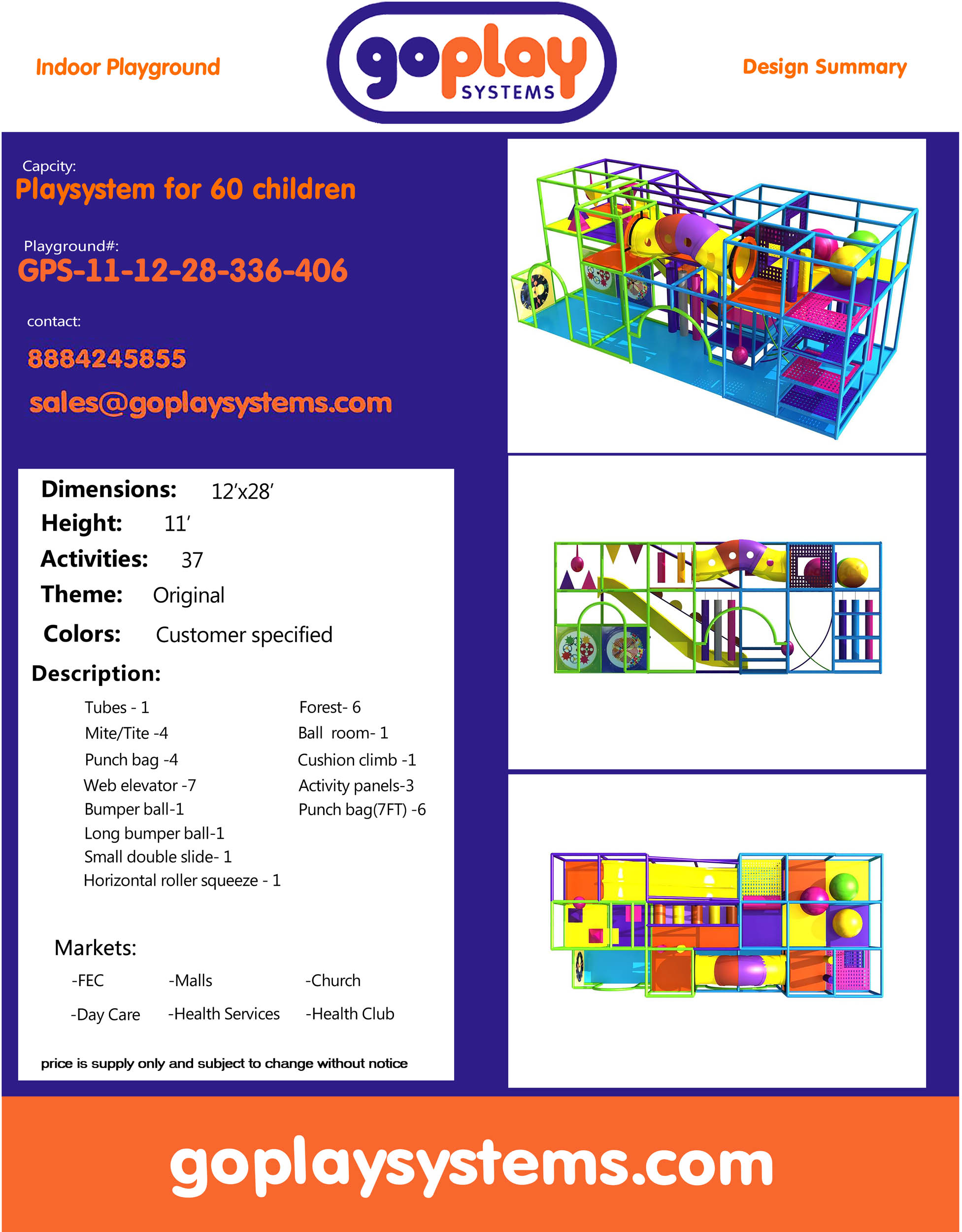 Indoor Playground GPS406 is a custom indoor playsystem for children three to twelve years of age. The softplay unit measures 12 ft. wide by 11 ft. high and a length of 28 ft. The minimum room space required for this children’s play equipment is approximately 18 ft. room width with a 13 ft. ceiling and 34 ft. room length. Medium Size Indoor Playground.