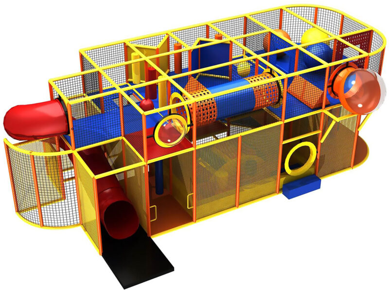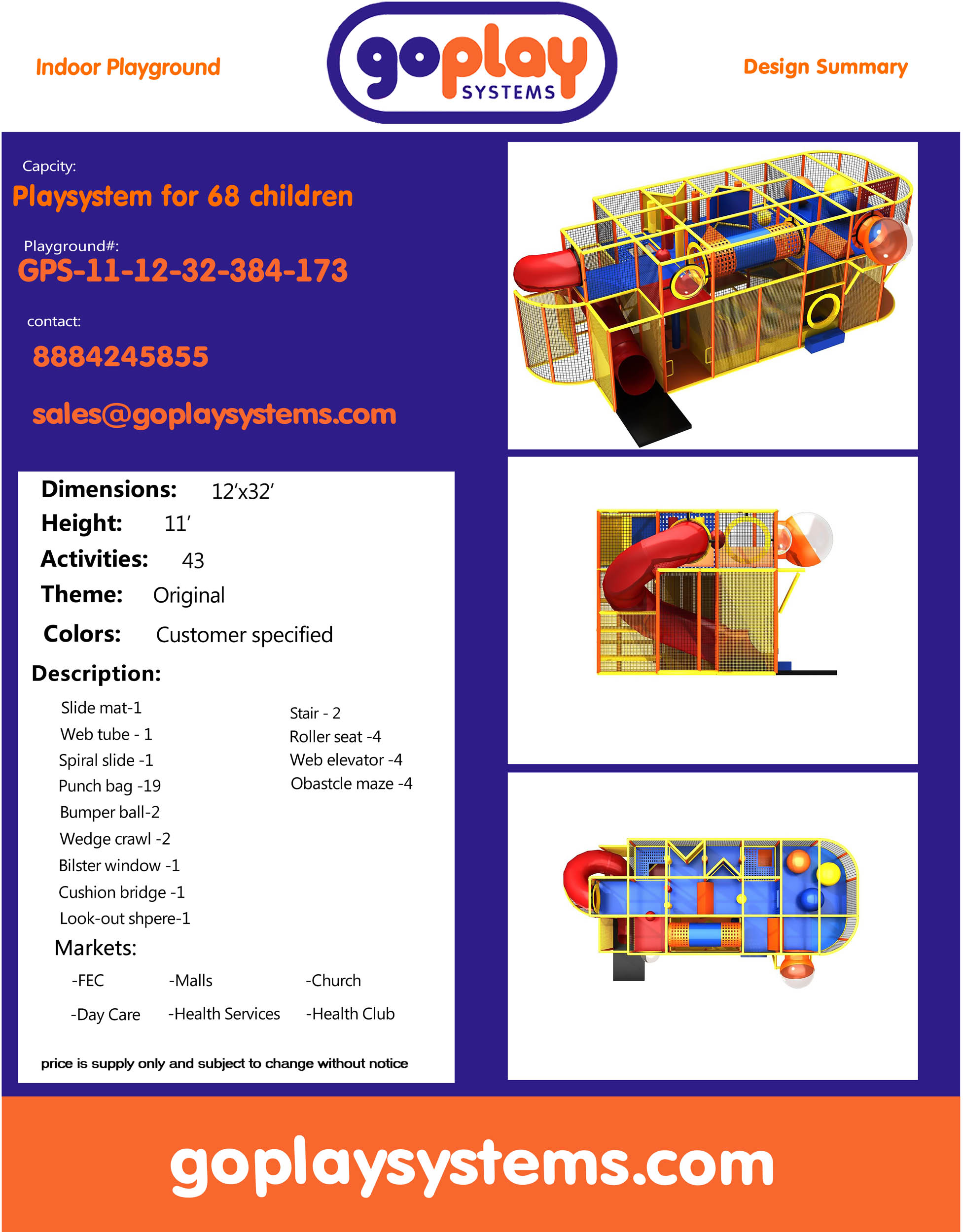 Indoor Playground GPS173 is a custom indoor playsystem for children three to twelve years of age. The softplay unit measures 12 ft. wide by 11 ft. high and a length of 32 ft. The minimum room space required for this children’s play equipment is approximately 18 ft. room width with a 13 ft. ceiling and 38 ft. room length. Medium Size Indoor Playground.