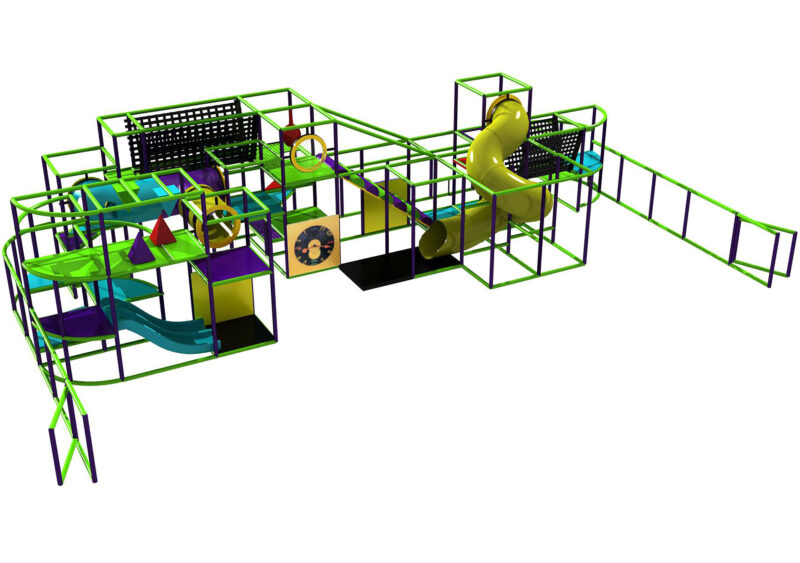 Indoor Playground GPS420 is a custom indoor playsystem for children three to twelve years of age. The softplay unit measures 25 ft. wide by 11 ft. high and a length of 47 ft. The minimum room space required for this children’s play equipment is approximately 31 ft. room width with a 13 ft. ceiling and 53 ft. room length. Medium Size Indoor Playground.