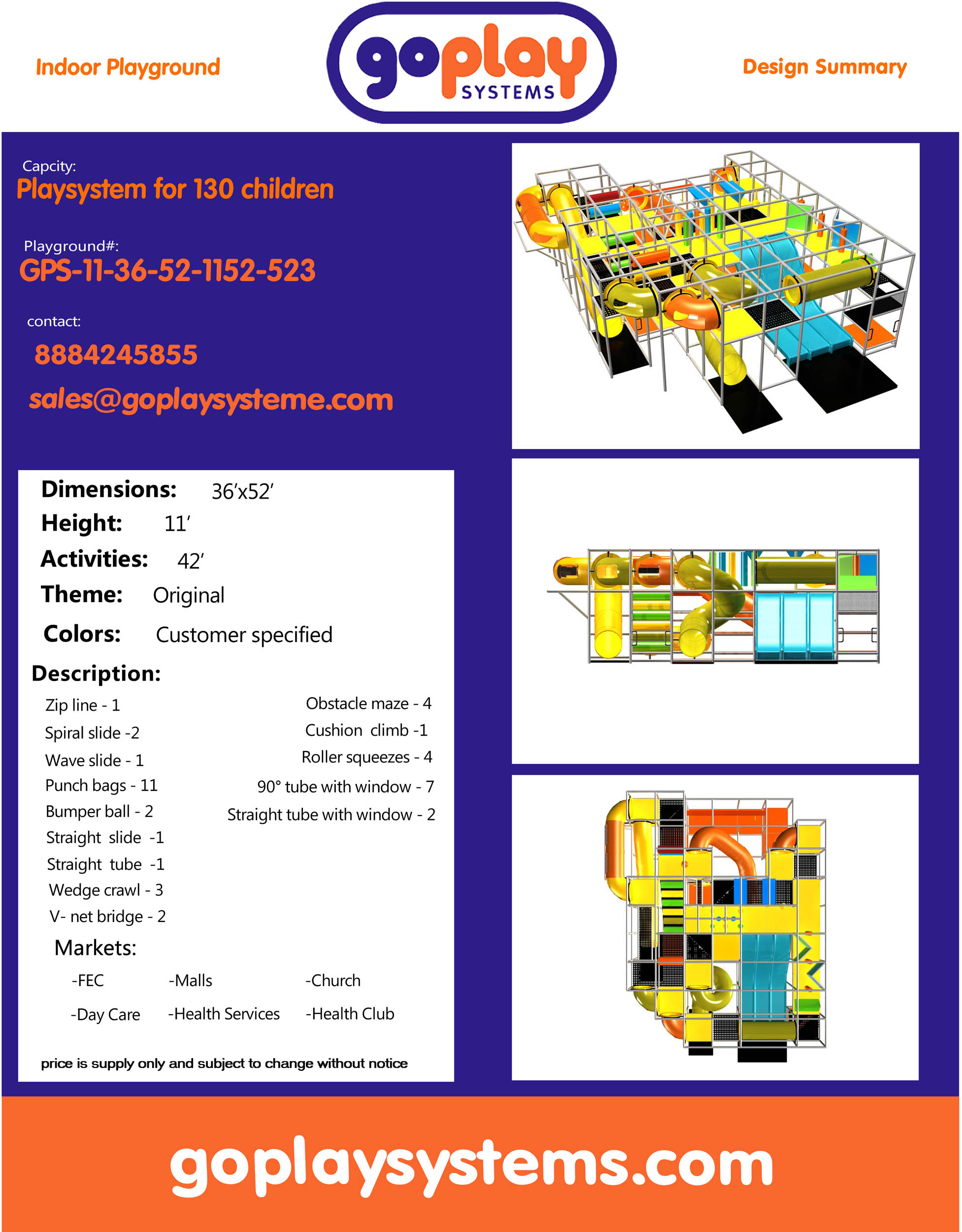 Indoor Playground GPS523 is a custom indoor playsystem for children three to twelve years of age. The softplay unit measures 36 ft. wide by 11 ft. high and a length of 52 ft. The minimum room space required for this children’s play equipment is approximately 42 ft. room width with a 13 ft. ceiling and 58 ft. room length. Large Size Indoor Playground.