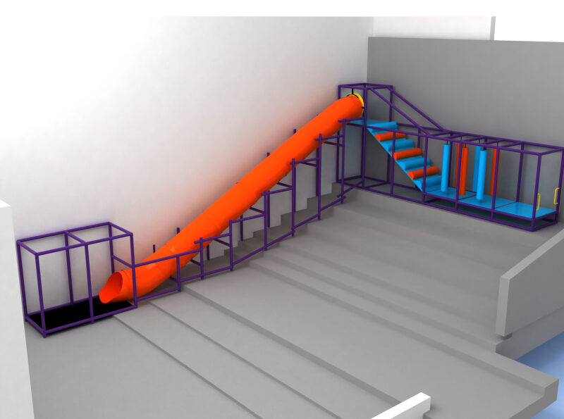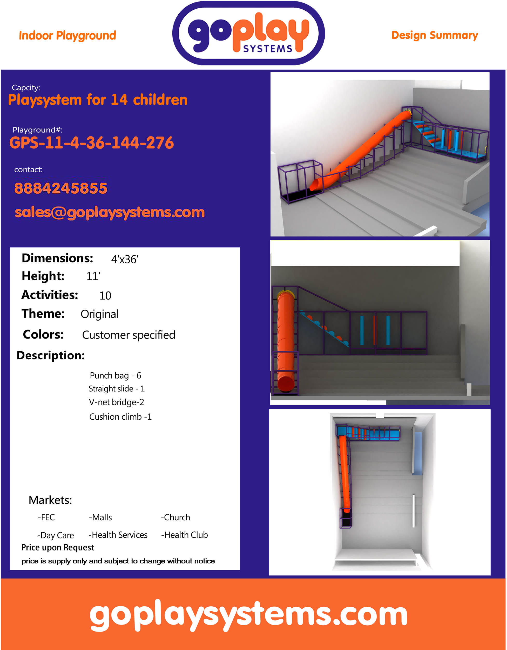 Indoor Playground GPS276 is a custom indoor playsystem for children three to twelve years of age. The softplay unit measures 4 ft. wide by 11 ft. high and a length of 36 ft. The minimum room space required for this children’s play equipment is approximately 10 ft. room width with a 13 ft. ceiling and 42 ft. room length. Medium Size Indoor Playground.