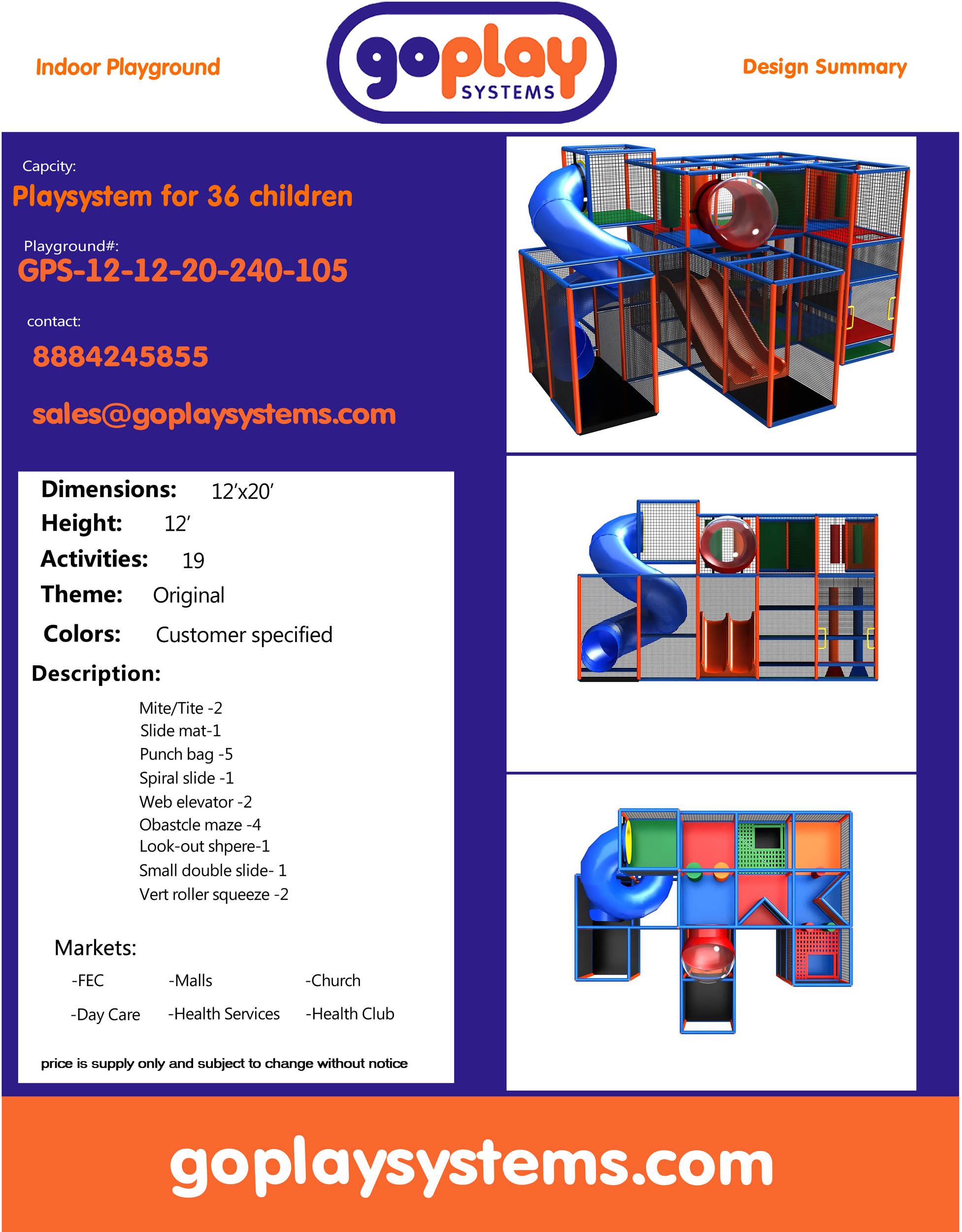 Indoor Playground GPS105 is a custom designed modular soft playground for children three to twelve years of age.. The indoor playsystem measures 12 ft. wide by 12 ft. high and a length of 20 ft. The minimum room space required for this indoor playground is approximately 18 ft. room width with a 14 ft. ceiling and 26 ft. room length. Medium Size Indoor Playground.