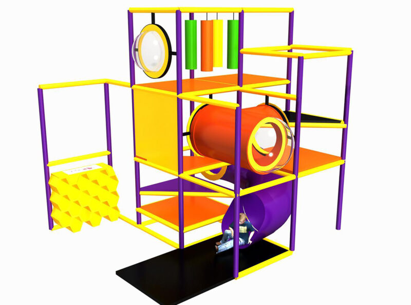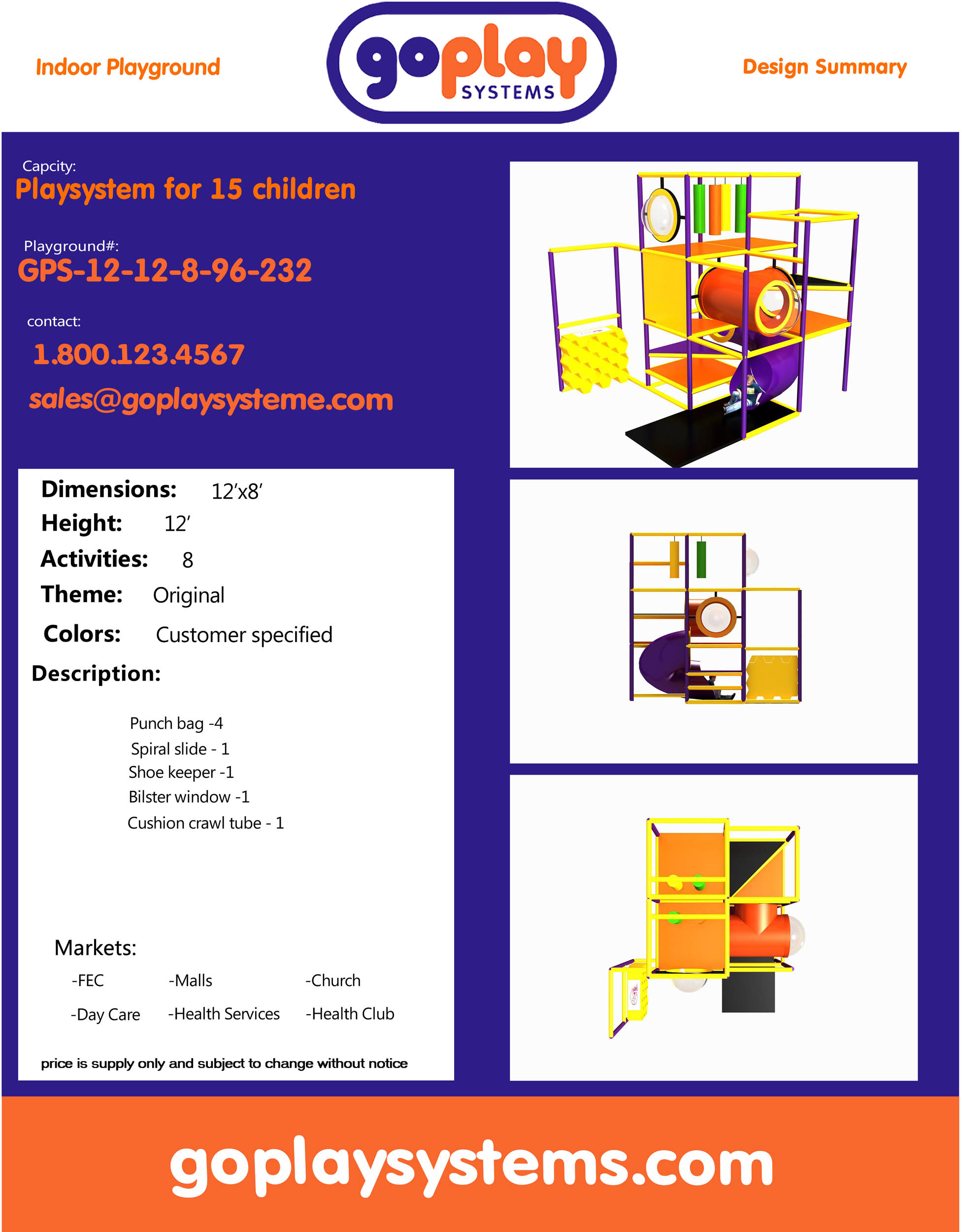 Indoor Playground GPS232 is a custom designed modular soft playground for children three to twelve years of age.. The indoor playsystem measures 12 ft. wide by 12 ft. high and a length of 8 ft. The minimum room space required for this indoor playground is approximately 18 ft. room width with a 14 ft. ceiling and 14 ft. room length. Medium Size Indoor Playground.