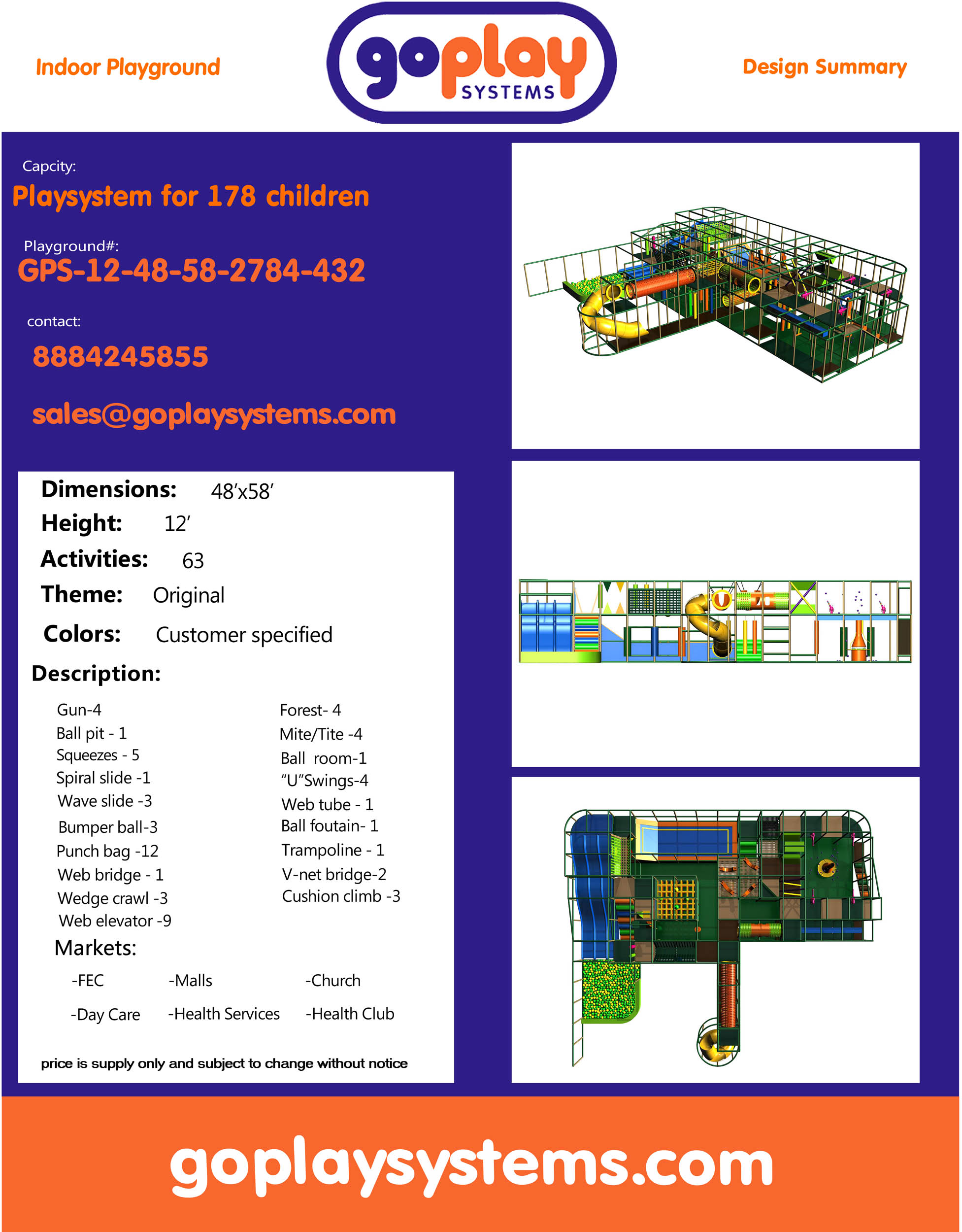 Indoor Playground GPS432 is a custom designed modular soft playground for children three to twelve years of age.. The indoor playsystem measures 48 ft. wide by 12 ft. high and a length of 58 ft. The minimum room space required for this indoor playground is approximately 54 ft. room width with a 14 ft. ceiling and 64 ft. room length. Large Size Indoor Playground.