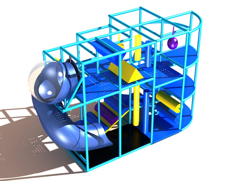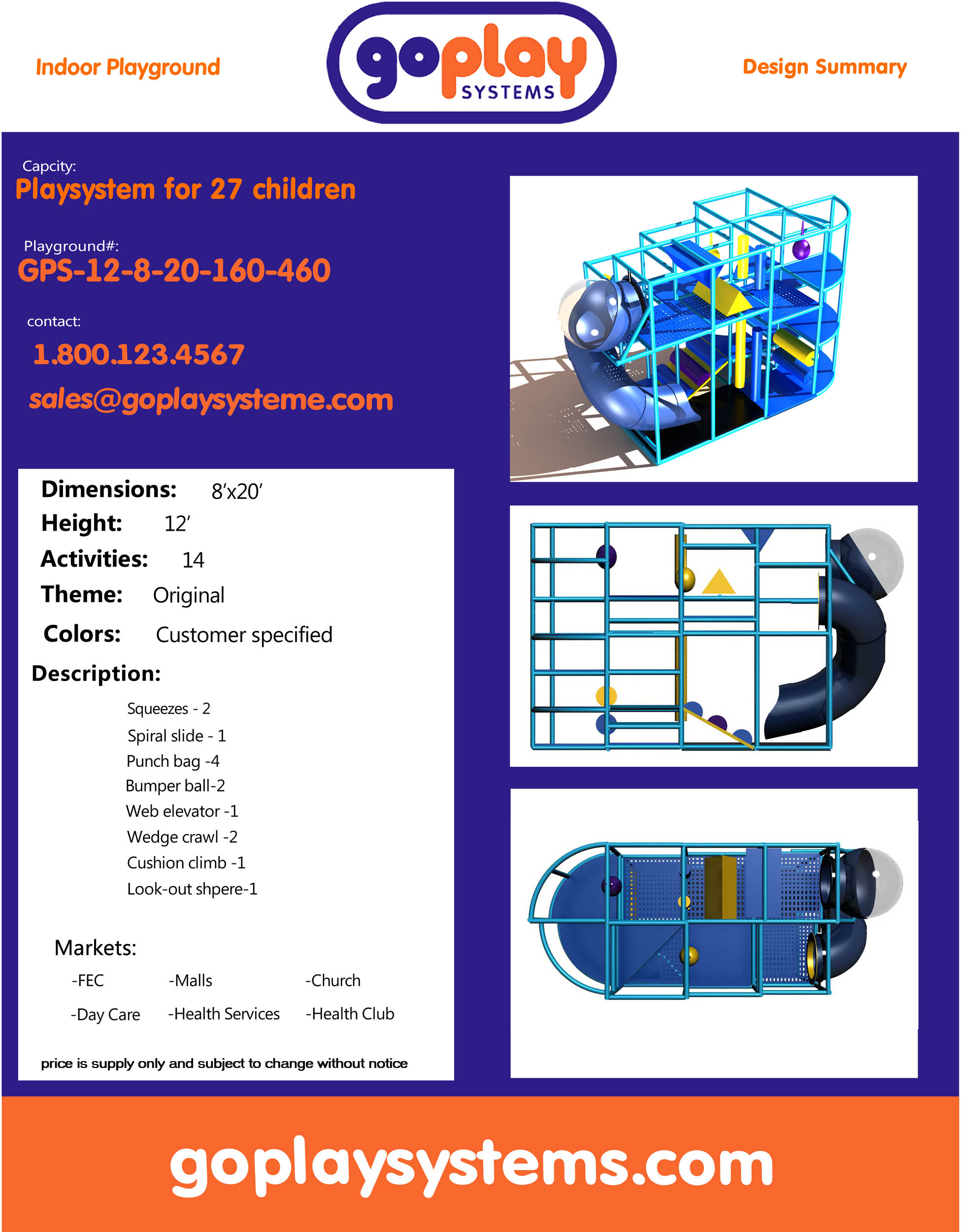 Indoor Playground GPS460 is a custom designed modular soft playground for children three to twelve years of age.. The indoor playsystem measures 8 ft. wide by 12 ft. high and a length of 20 ft. The minimum room space required for this indoor playground is approximately 14 ft. room width with a 14 ft. ceiling and 26 ft. room length. Medium Size Indoor Playground.