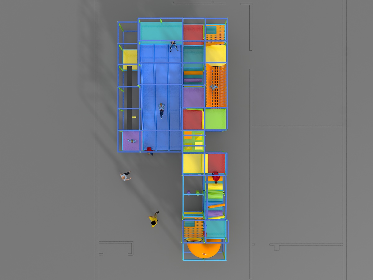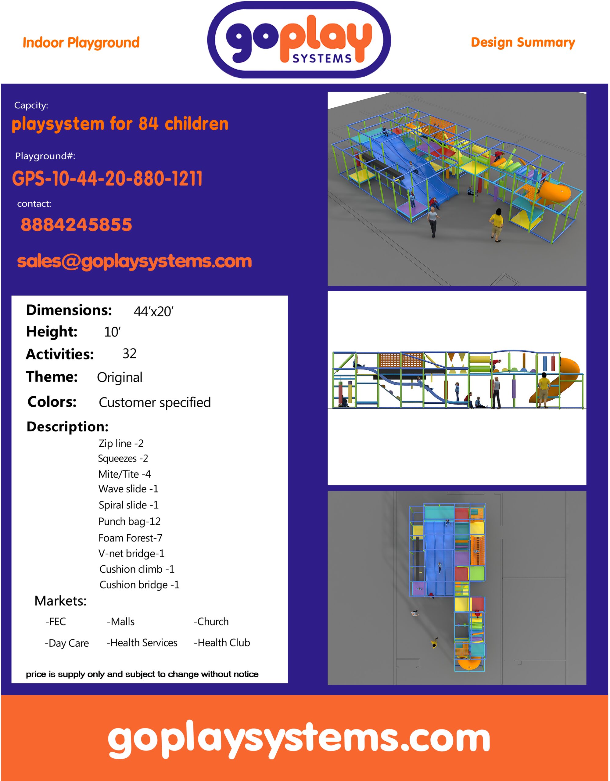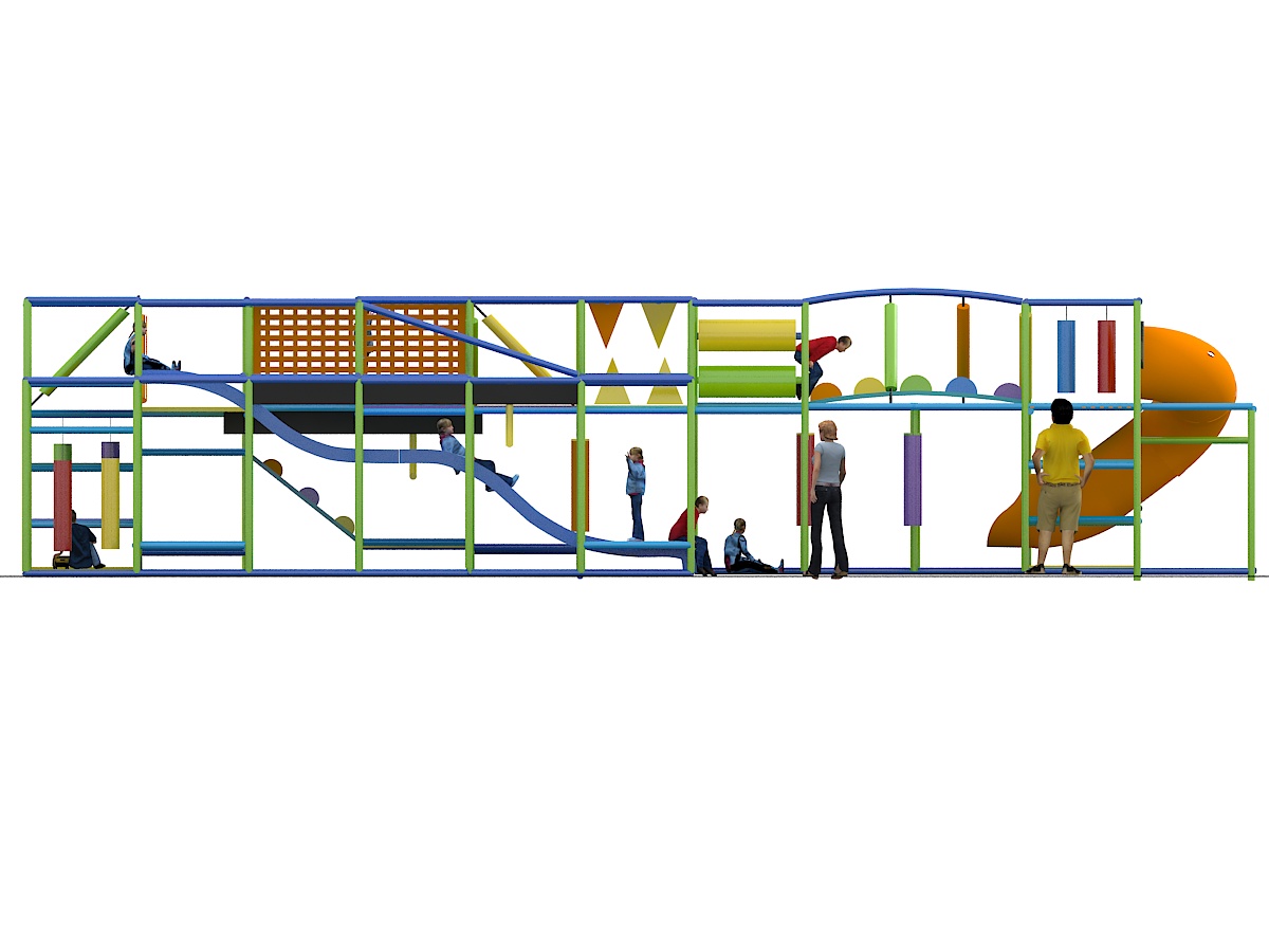 Indoor Playground GPS1211 is a custom indoor playsystem for children three to twelve years of age. The softplay unit measures 44 ft. wide by 10 ft. high and a length of 20 ft. The minimum room space required for this children’s play equipment is approximately 50 ft. room width with a 12 ft. ceiling and 26 ft. room length. Total area: 880 sq ft. Medium Size Indoor Playground.