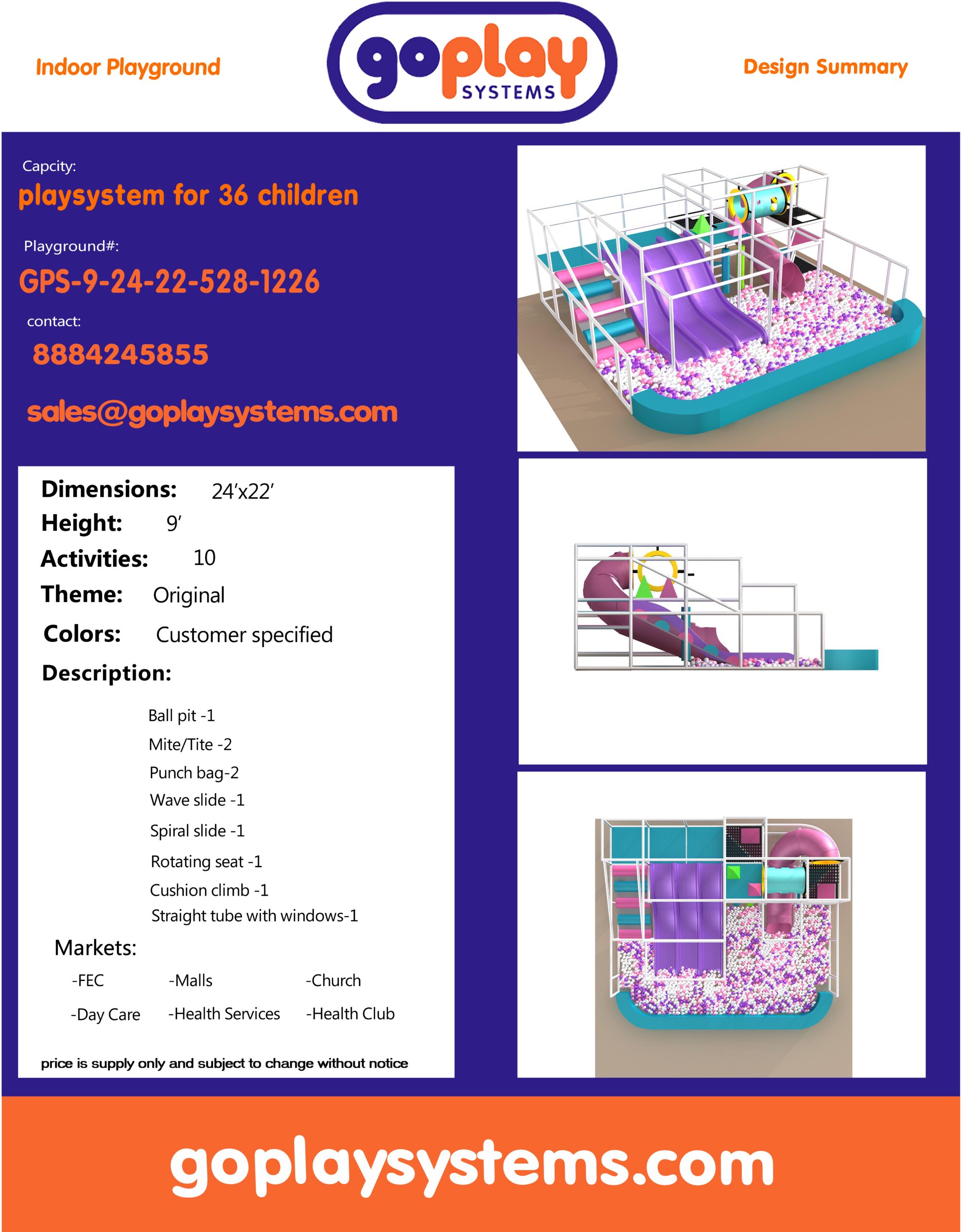 Availability: In-stock Brand: Go Play Systems SKU: gps-9-24-22-528-1226 Shipping: Free Shipping US to lower 48 states. Shipping Policy Return and Refund Policy *GoPlay sells worldwide. Prices may not include additional shipping and handling charges to your specific location. Contact us for current international shipping rates.