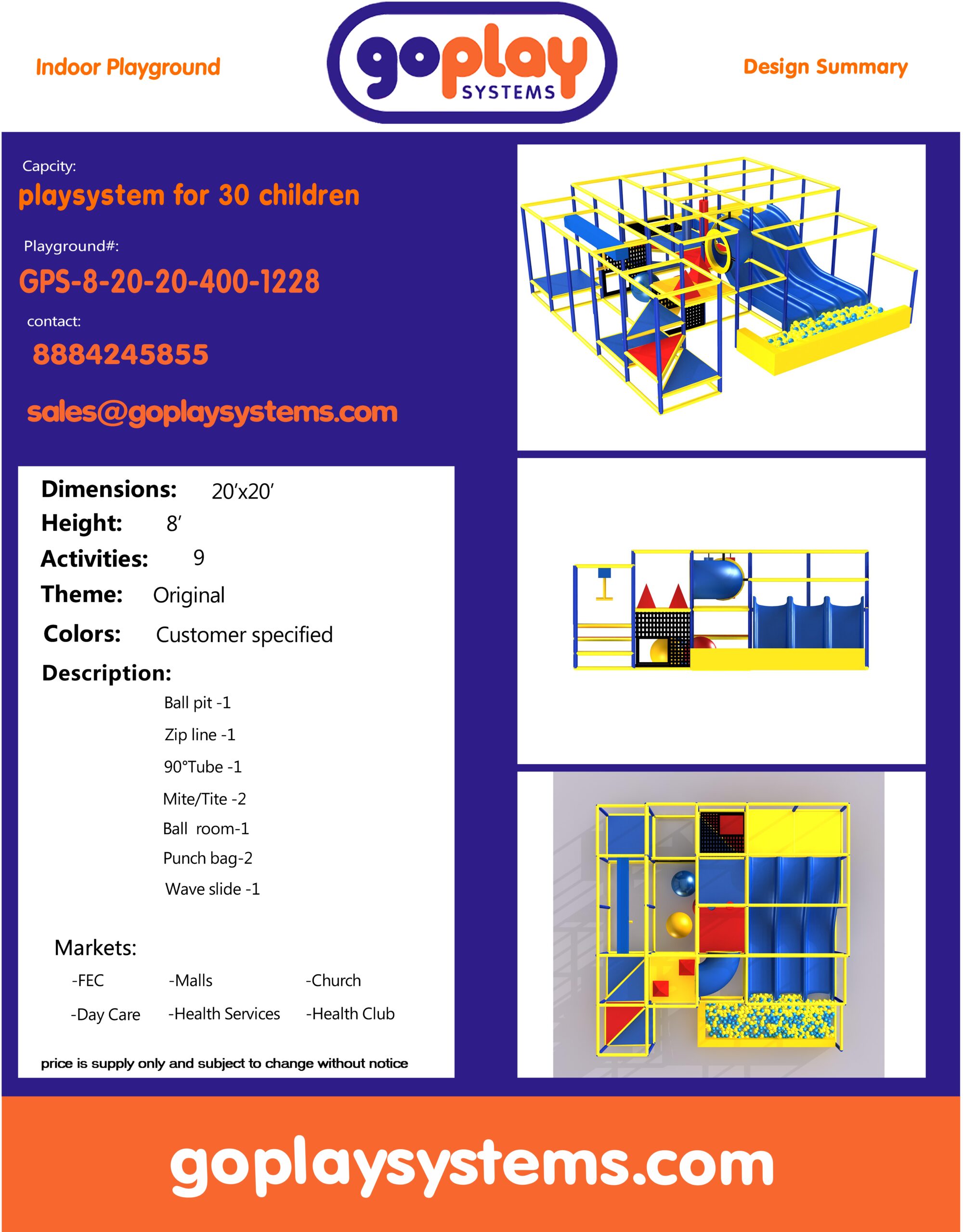 Availability: In-stock Brand: Go Play Systems SKU: gps-8-20-20-400-1228 Shipping: Free Shipping US to lower 48 states. Shipping Policy Return and Refund Policy *GoPlay sells worldwide. Prices may not include additional shipping and handling charges to your specific location. Contact us for current international shipping rates.