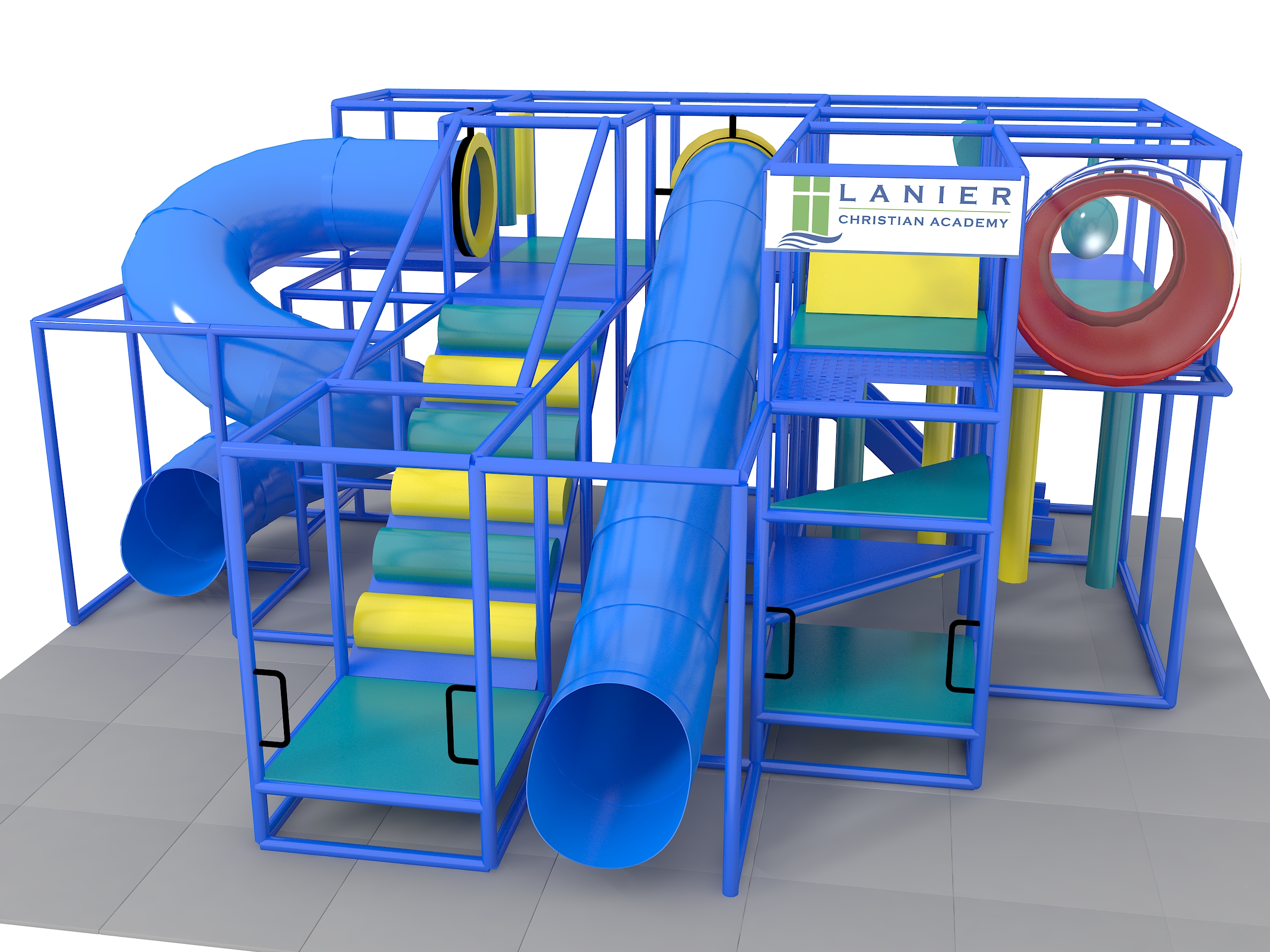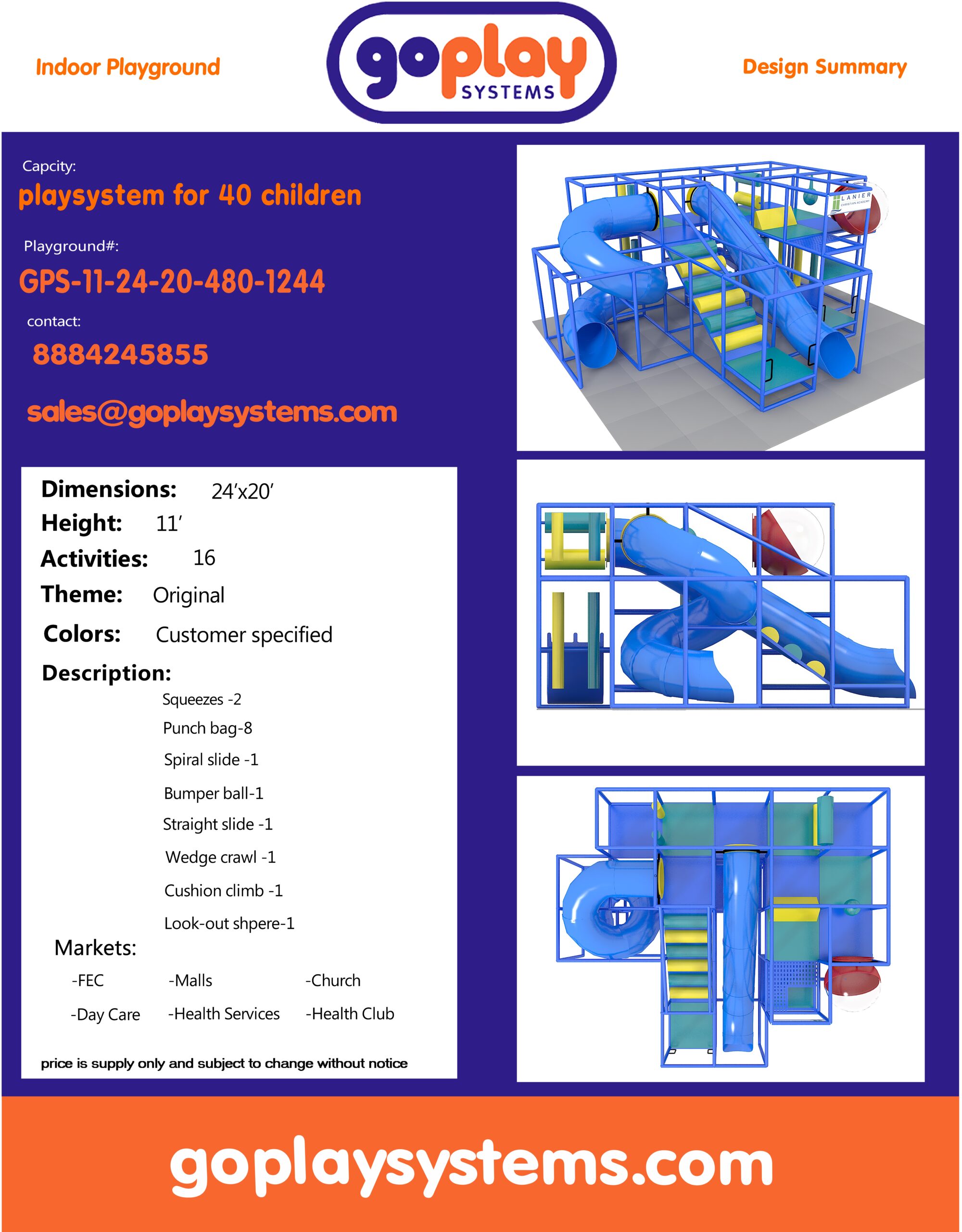 Indoor Playground GPS1244 is a custom indoor playsystem for children three to twelve years of age. The softplay unit measures 24 ft. wide by 11 ft. high and a length of 20 ft. The minimum room space required for this children’s play equipment is approximately 30 ft. room width with a 13 ft. ceiling and 26 ft. room length. Total area: 480 sq ft. Medium Size Indoor Playground.