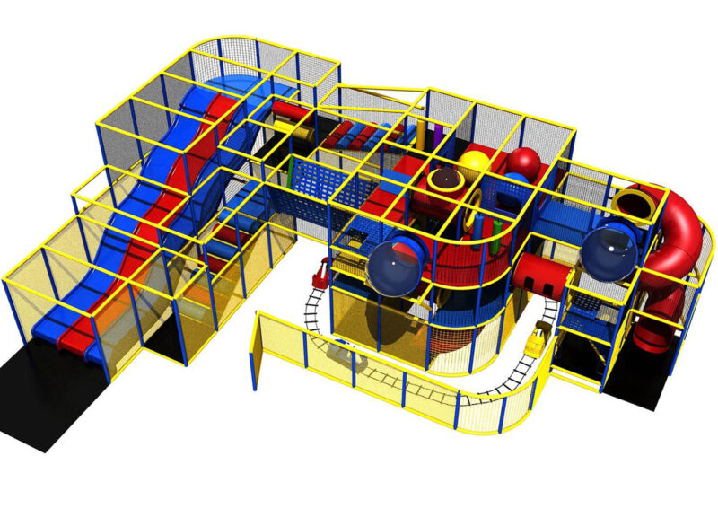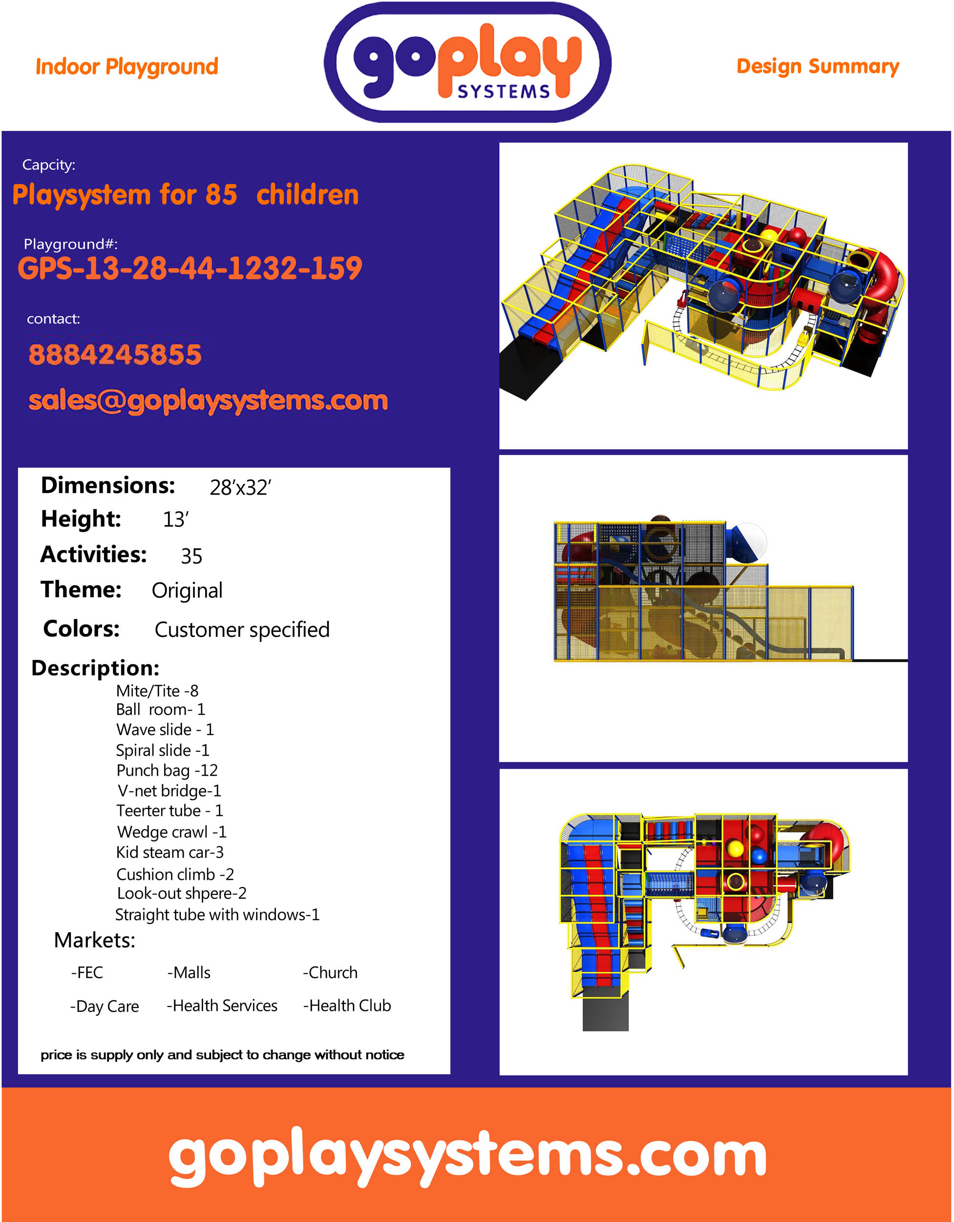 Indoor Playground GPS159 is a custom designed modular soft playground for children three to twelve years of age.. The indoor playsystem measures 28 ft. wide by 13 ft. high and a length of 44 ft. The minimum room space required for this indoor playground is approximately 34 ft. room width with a 15 ft. ceiling and 50 ft. room length. Medium Size Indoor Playground.