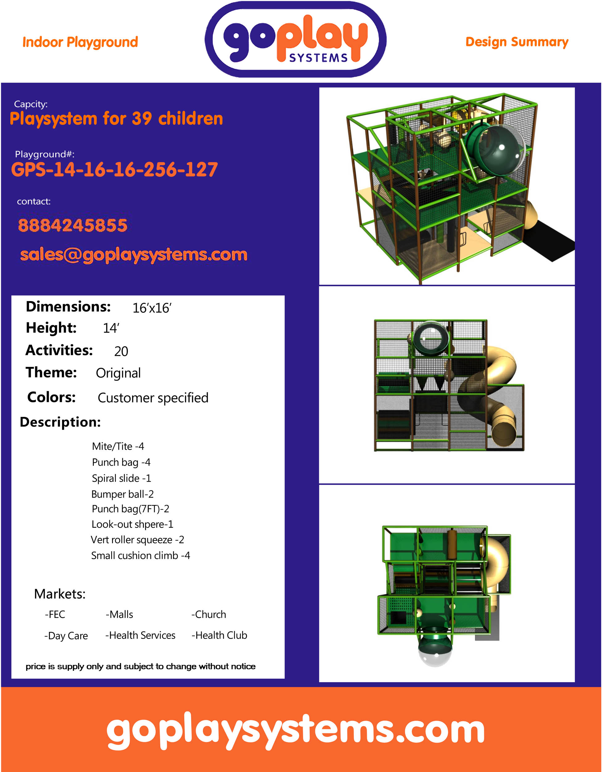 Indoor Playground GPS is a custom designed modular soft playground for children three to twelve years of age.. The indoor playsystem measures 16 ft. wide by 14 ft. high and a length of 16 ft. The minimum room space required for this indoor playground is approximately 22 ft. room width with a 16 ft. ceiling and 22 ft. room length. Medium Size Indoor Playground.