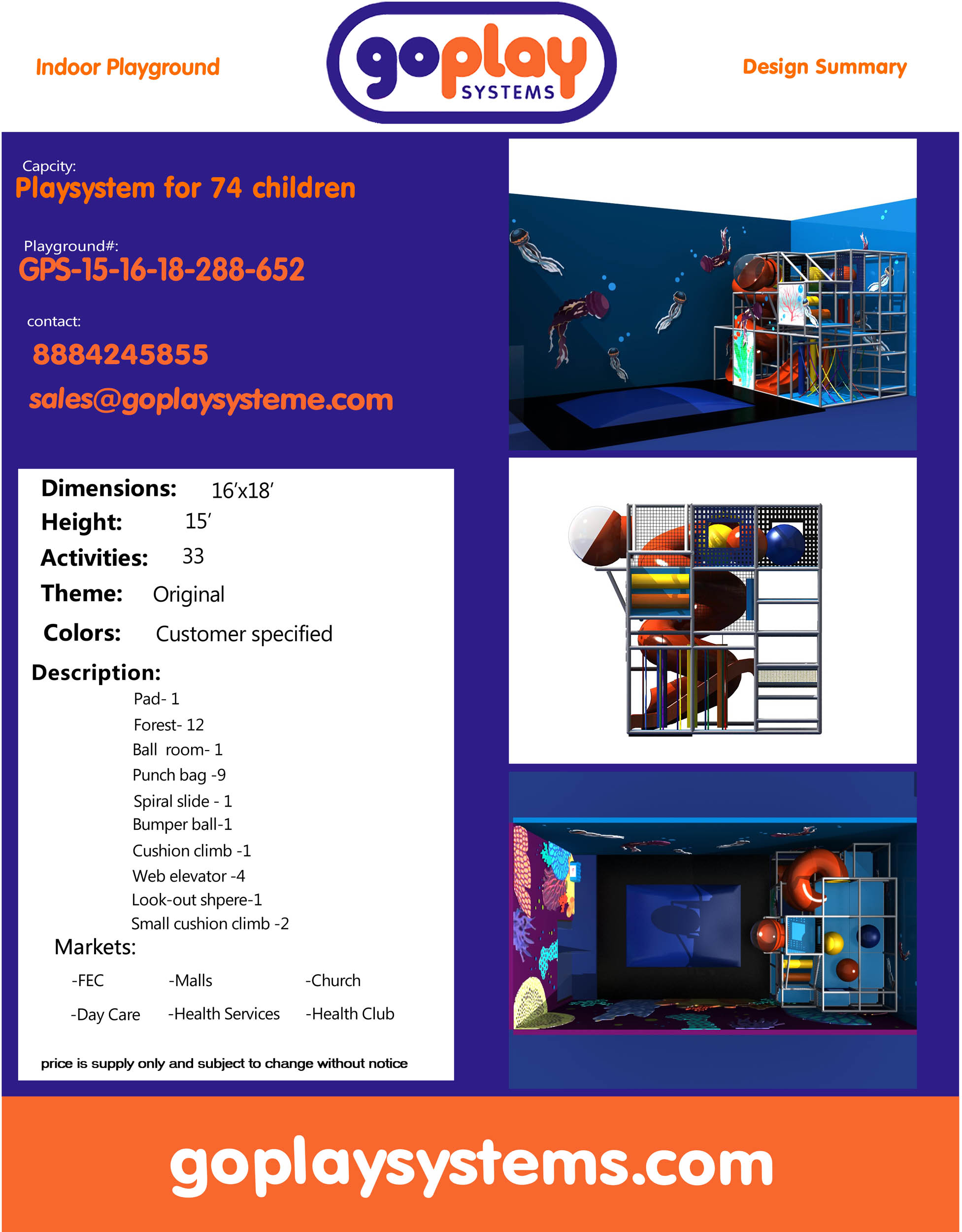 Indoor Playground GPS652 is a custom designed modular soft playground for children three to twelve years of age.. The indoor playsystem measures 16 ft. wide by 15 ft. high and a length of 18 ft. The minimum room space required for this indoor playground is approximately 22 ft. room width with a 17 ft. ceiling and 24 ft. room length. Medium Size Indoor Playground.