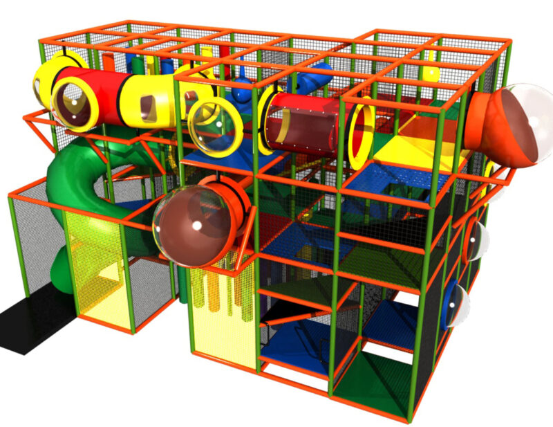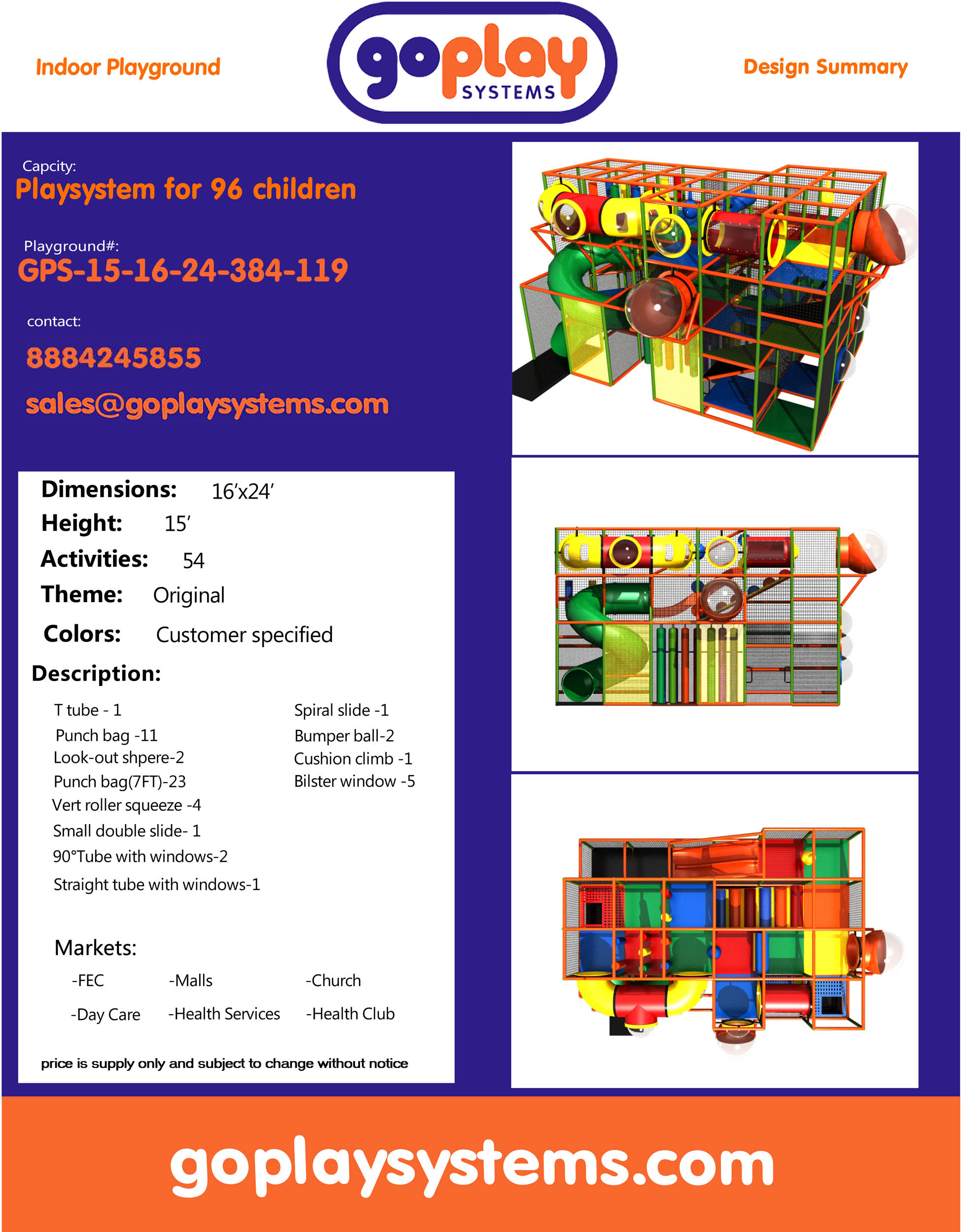 Indoor Playground GPS119 is a custom designed modular soft playground for children three to twelve years of age.. The indoor playsystem measures 16 ft. wide by 15 ft. high and a length of 24 ft. The minimum room space required for this indoor playground is approximately 22 ft. room width with a 17 ft. ceiling and 30 ft. room length. Medium Size Indoor Playground.