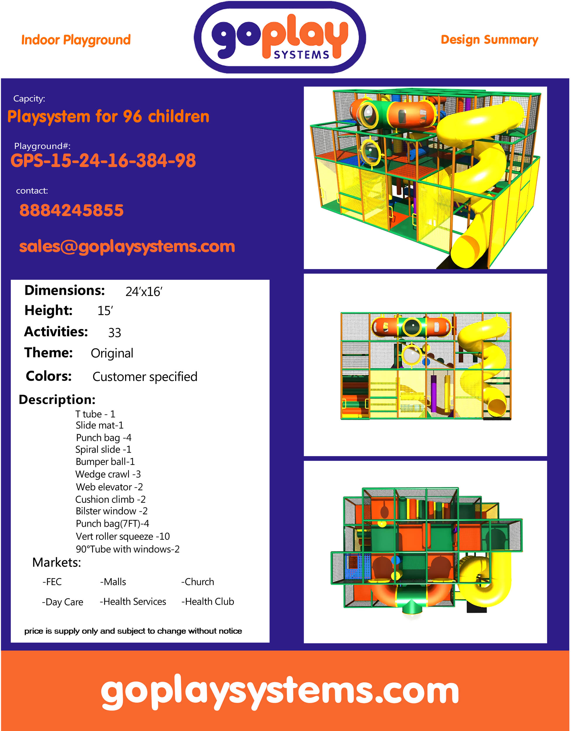 Indoor Playground GPS98 is a custom designed modular soft playground for children three to twelve years of age.. The indoor playsystem measures 16 ft. wide by 15 ft. high and a length of 24 ft. The minimum room space required for this indoor playground is approximately 22 ft. room width with a 17 ft. ceiling and 30 ft. room length. Medium Size Indoor Playground.