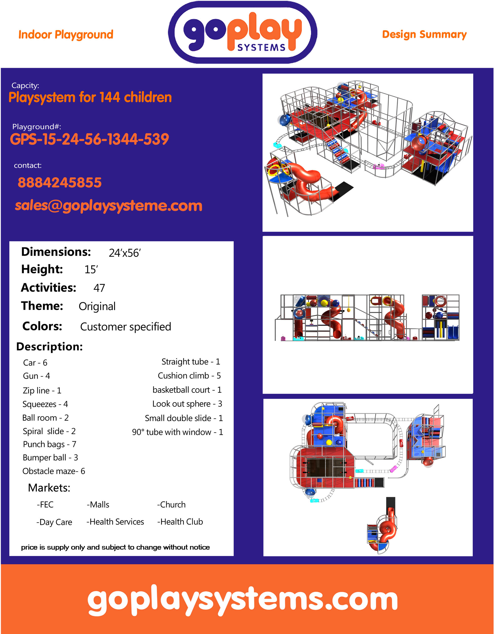 Indoor Playground GPS539 is a custom made indoor play system for children ages three to twelve. The soft playground measures 24 ft. wide by 15 ft. high and a length of 56 ft. The minimum room space required for this indoor playground is approximately 30 ft. room width with a 17 ft. ceiling and 62 ft. room length. Medium Size Indoor Playground.