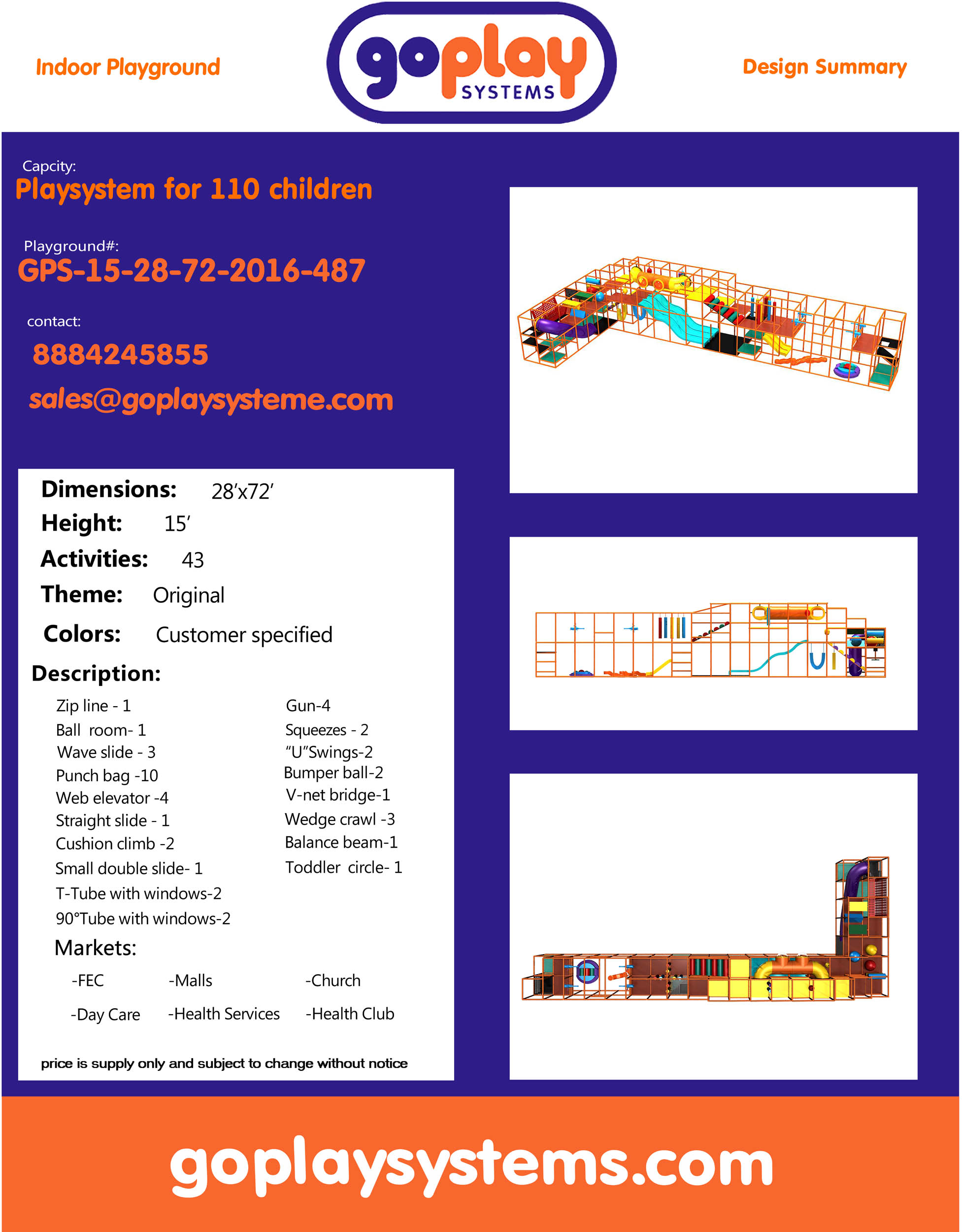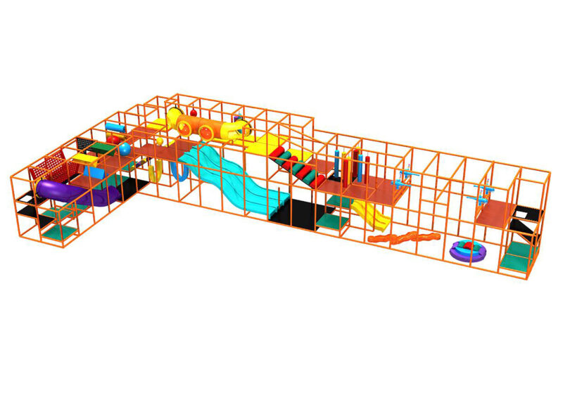 Indoor Playground GPS487 is a custom made indoor play system for children ages three to twelve. The soft playground measures 28 ft. wide by 15 ft. high and a length of 72 ft. The minimum room space required for this indoor playground is approximately 34 ft. room width with a 17 ft. ceiling and 78 ft. room length. Medium Size Indoor Playground.