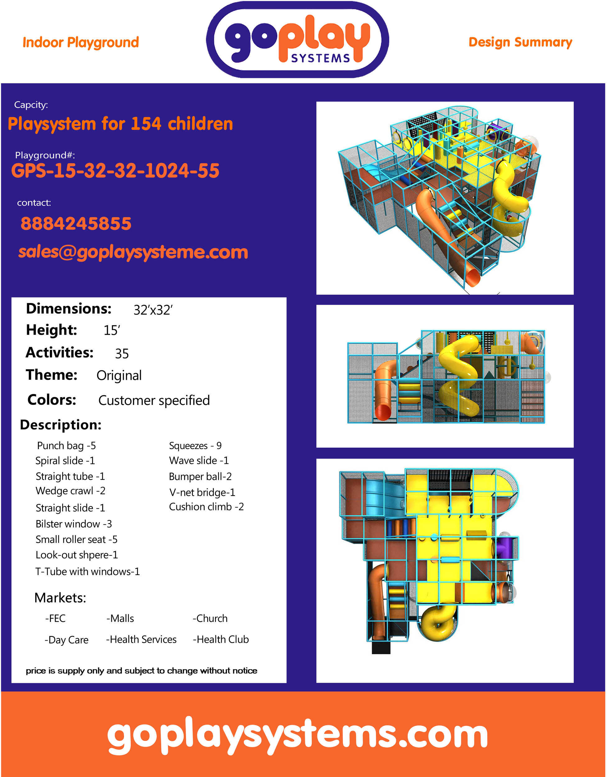 Indoor Playground GPS55 is a custom made indoor play system for children ages three to twelve. The soft playground measures 32 ft. wide by 15 ft. high and a length of 32 ft. The minimum room space required for this indoor playground is approximately 38 ft. room width with a 17 ft. ceiling and 38 ft. room length. Medium Size Indoor Playground.