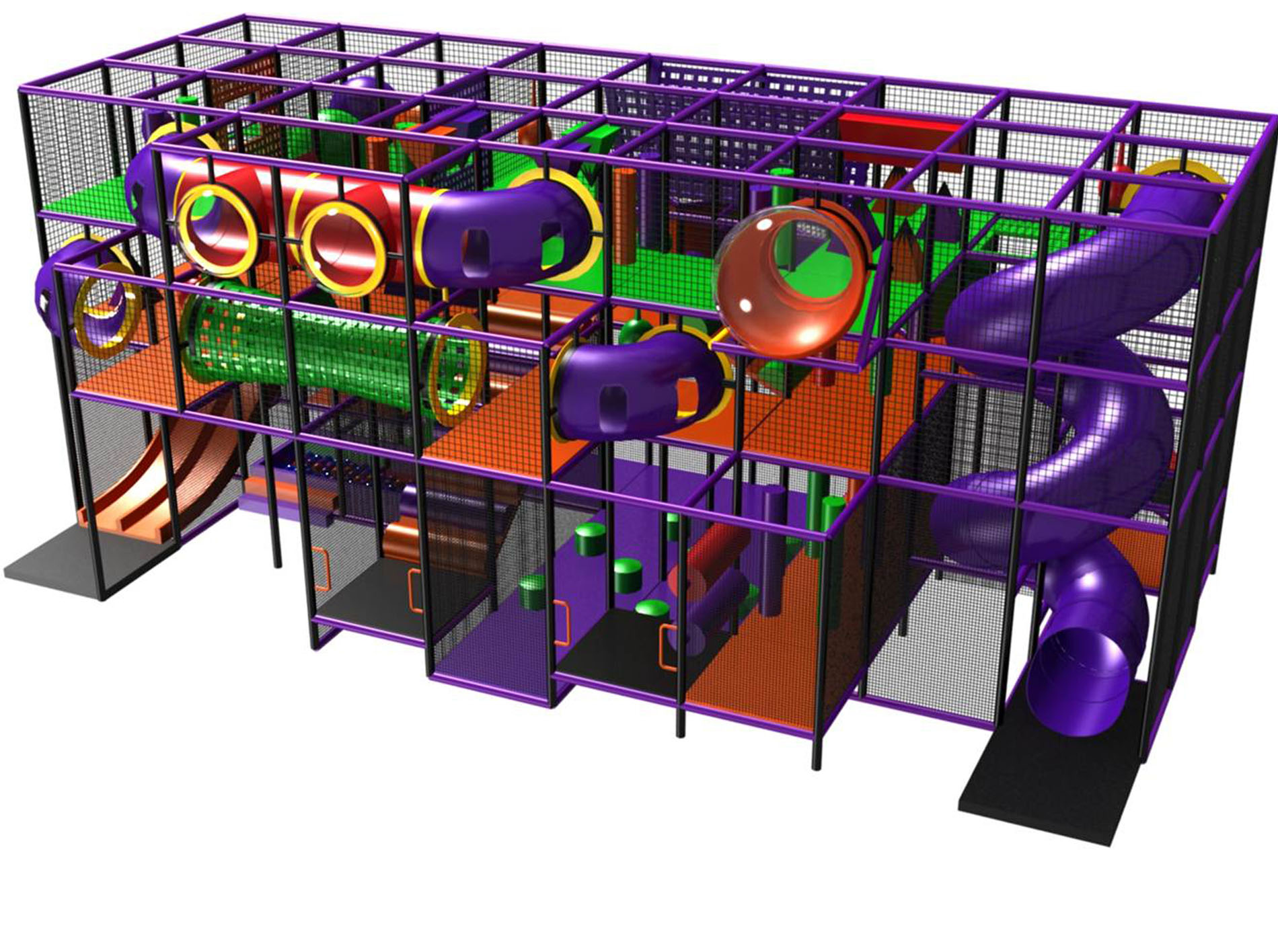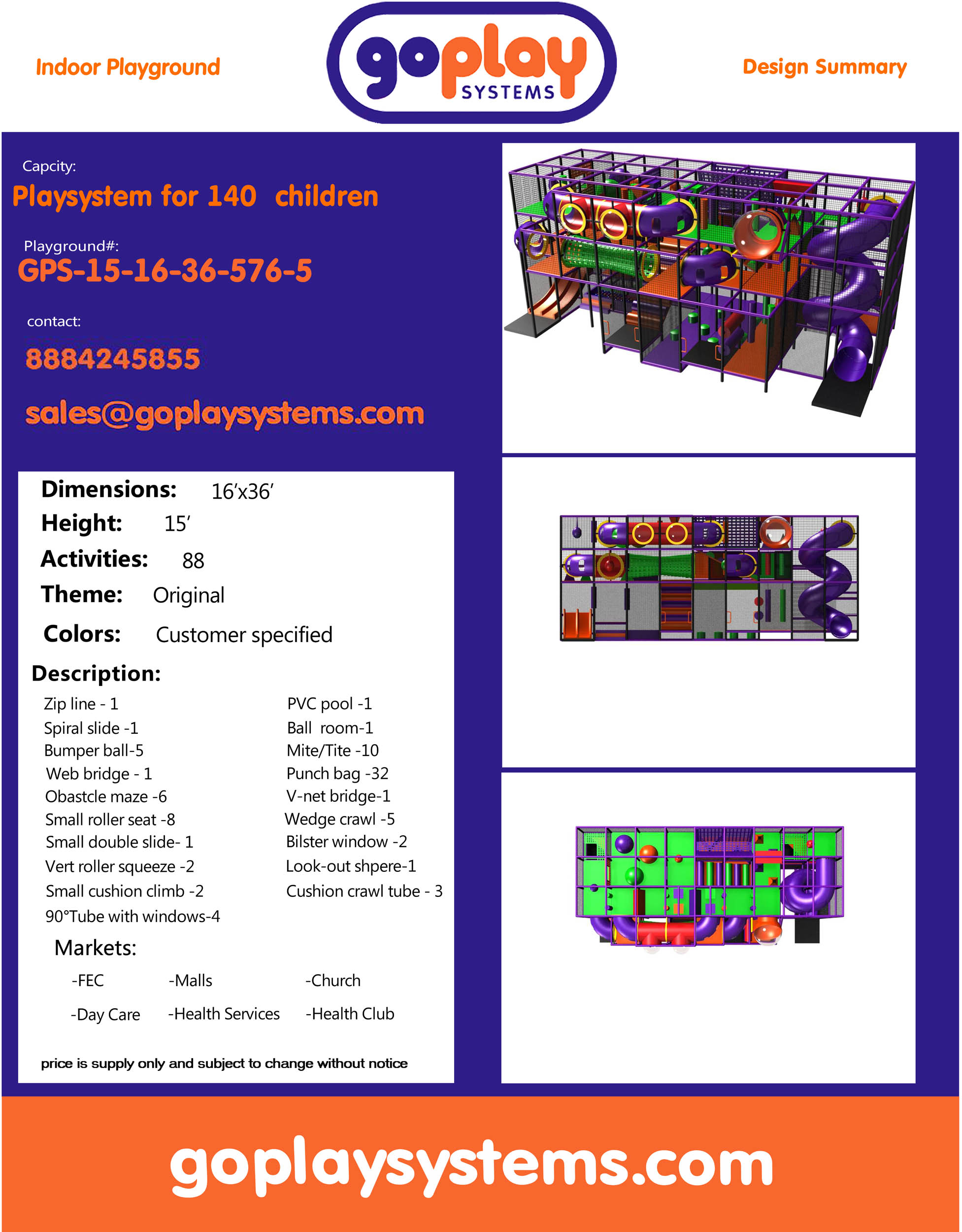 Indoor Playground GPS5 is a custom made indoor play system for children ages three to twelve. The soft playground measures 36 ft. wide by 15 ft. high and a length of 20 ft. The minimum room space required for this indoor playground is approximately 42 ft. room width with a 17 ft. ceiling and 26 ft. room length. Large Size Indoor Playground.