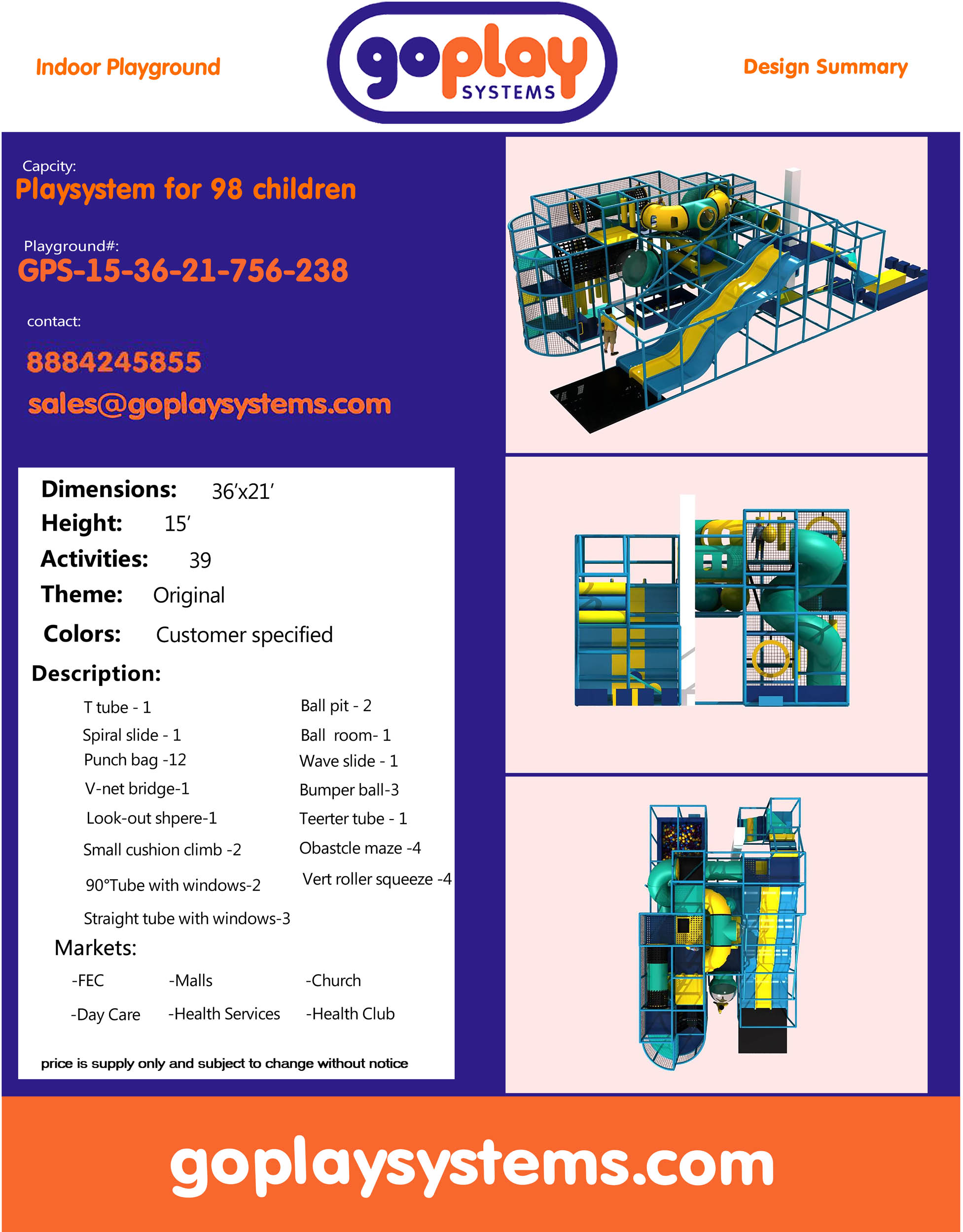 Indoor Playground GPS238 is a custom made indoor play system for children ages three to twelve. The soft playground measures 36 ft. wide by 15 ft. high and a length of 21 ft. The minimum room space required for this indoor playground is approximately 42 ft. room width with a 17 ft. ceiling and 27 ft. room length. Large Size Indoor Playground.
