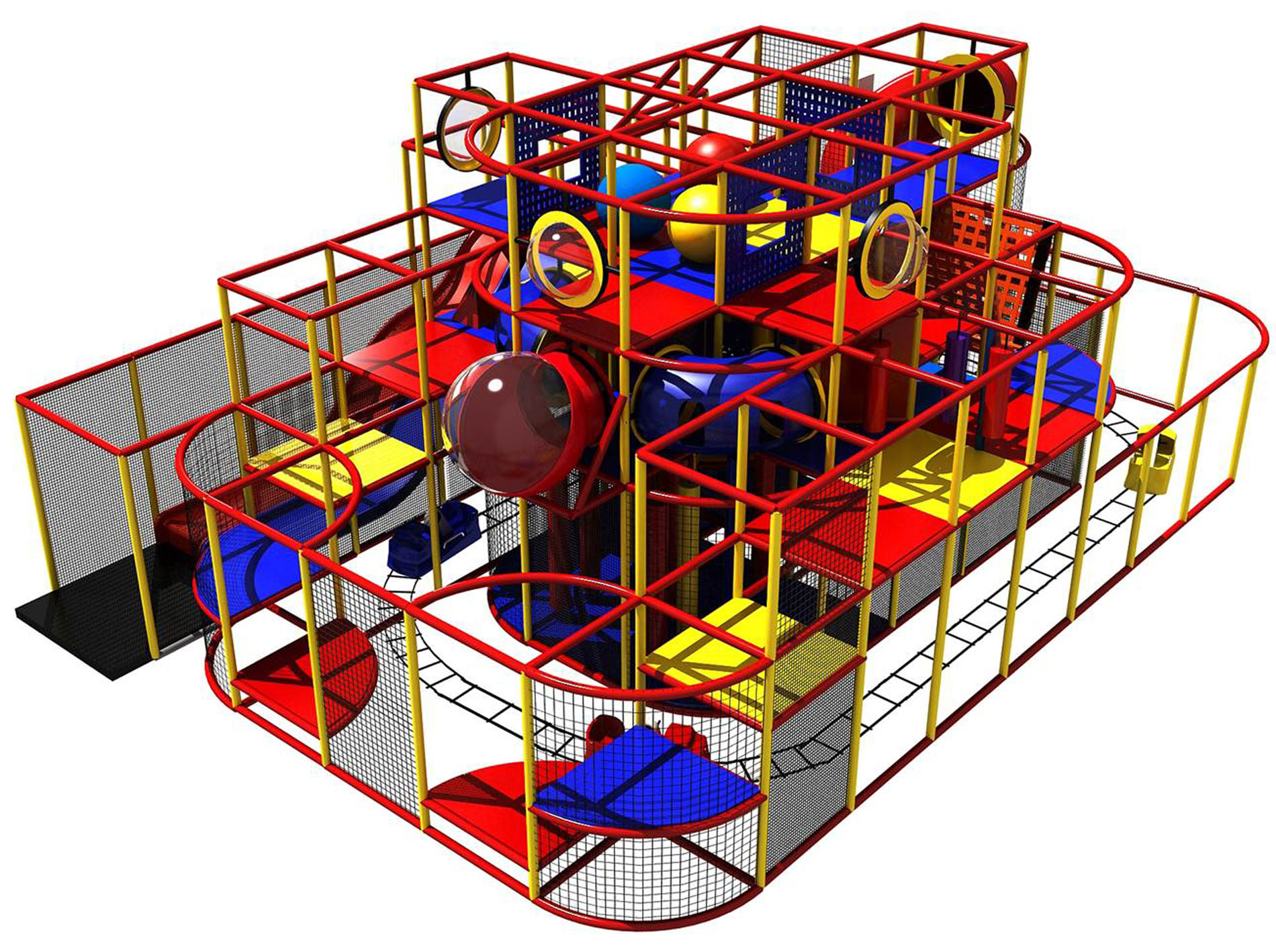 Indoor Playground GPS147 is a custom made indoor play system for children ages three to twelve. The soft playground measures 36 ft. wide by 15 ft. high and a length of 26 ft. The minimum room space required for this indoor playground is approximately 42 ft. room width with a 17 ft. ceiling and 32 ft. room length. Large Size Indoor Playground.