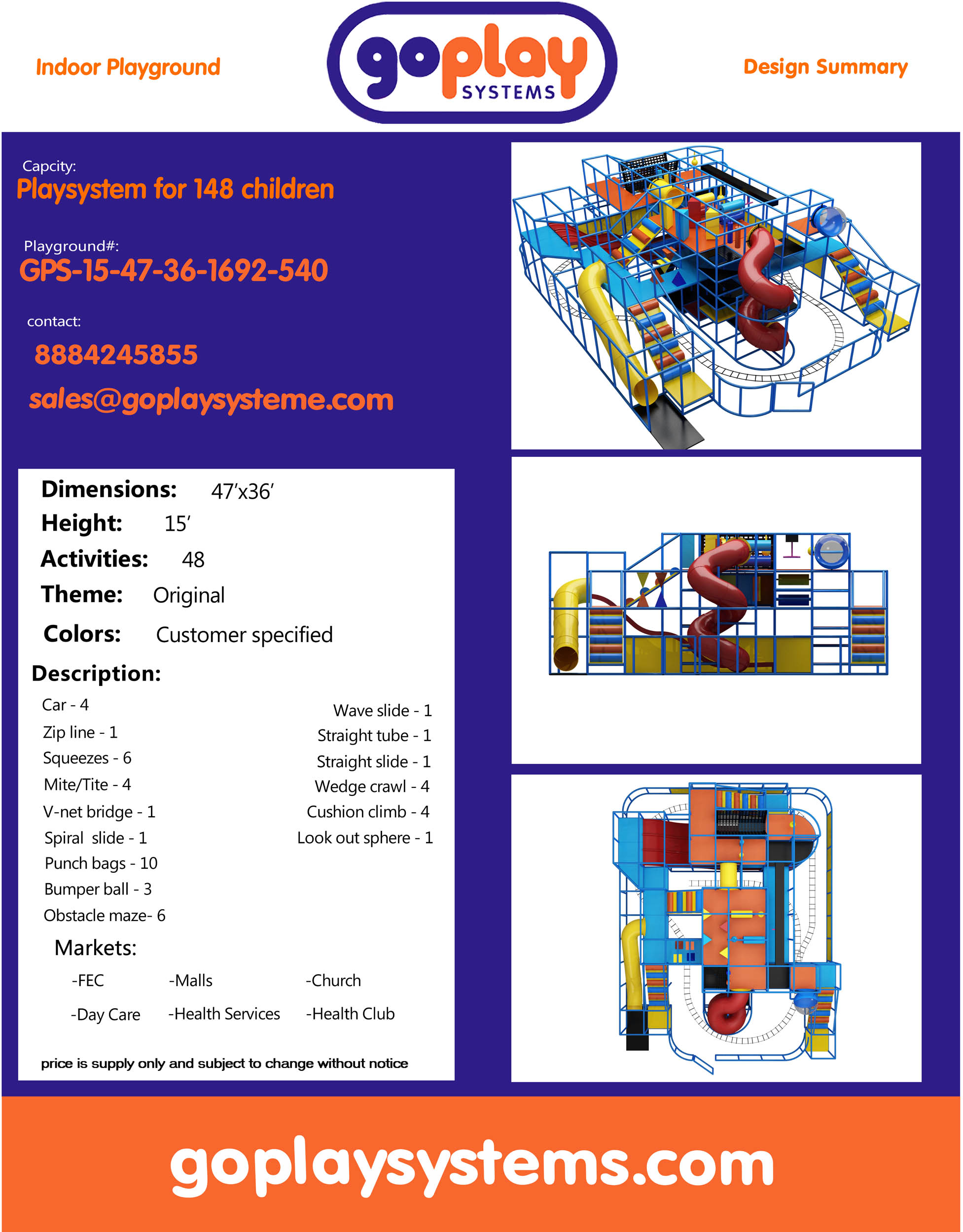 Indoor Playground GPS540 is a custom made indoor play system for children ages three to twelve. The soft playground measures 47 ft. wide by 15 ft. high and a length of 36 ft. The minimum room space required for this indoor playground is approximately 53 ft. room width with a 17 ft. ceiling and 42 ft. room length. Large Size Indoor Playground.