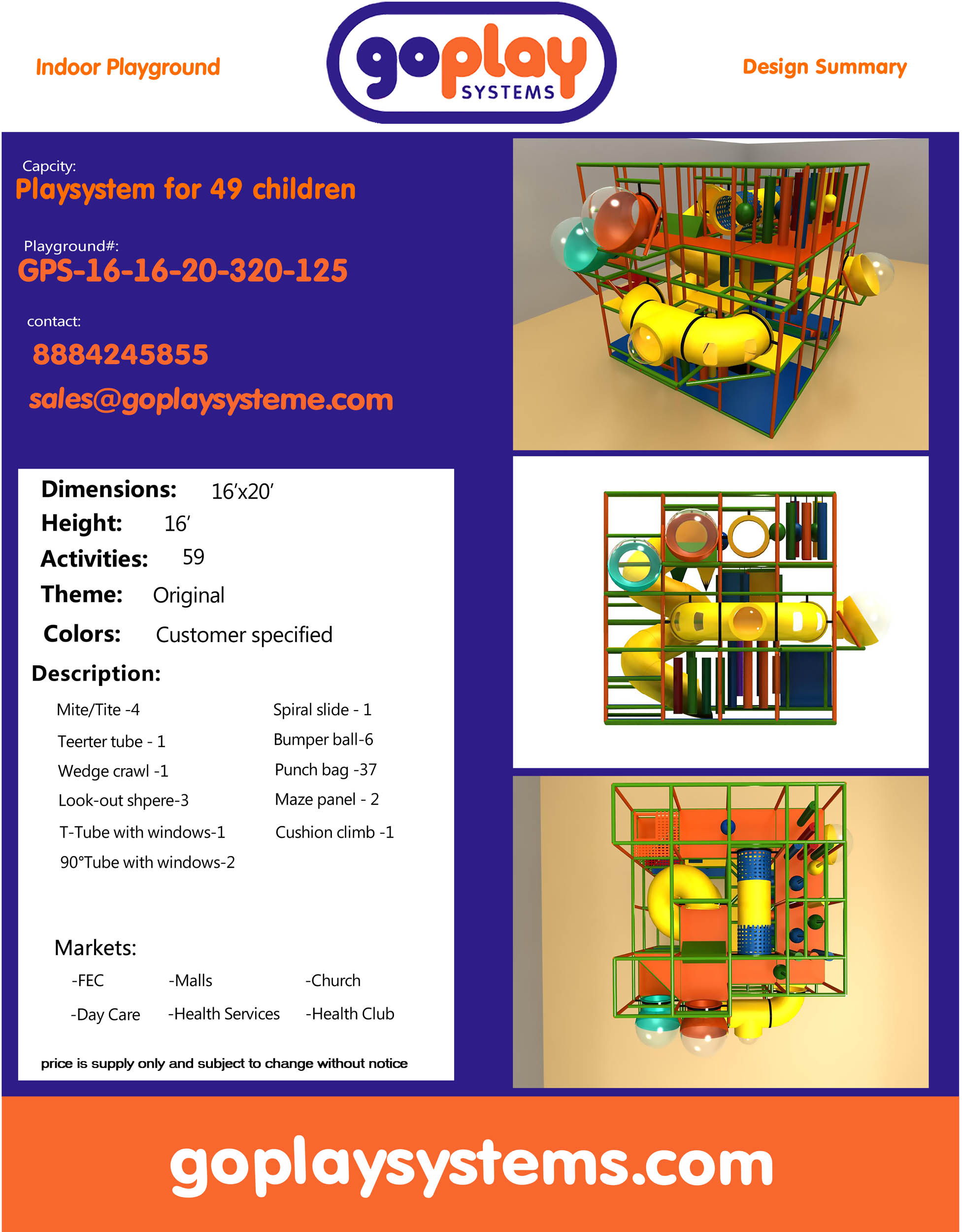 Indoor Playground GPS125 is a custom made indoor play system for children ages three to twelve. The soft playground measures 16 ft. wide by 16 ft. high and a length of 20 ft. The minimum room space required for this indoor playground is approximately 22 ft. room width with a 18 ft. ceiling and 26 ft. room length. Medium Size Indoor Playground.