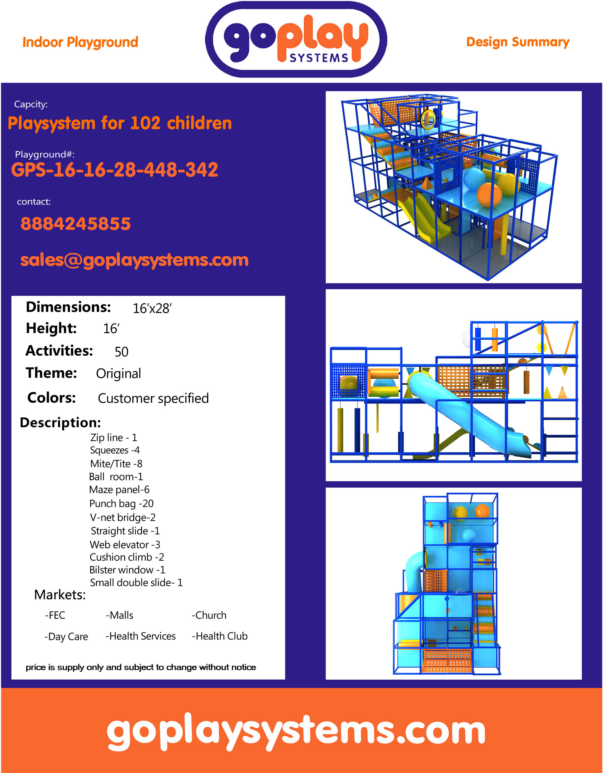 Indoor Playground GPS342 is a custom made indoor play system for children ages three to twelve. The soft playground measures 16 ft. wide by 16 ft. high and a length of 28 ft. The minimum room space required for this indoor playground is approximately 22 ft. room width with a 18 ft. ceiling and 34 ft. room length. Medium Size Indoor Playground.