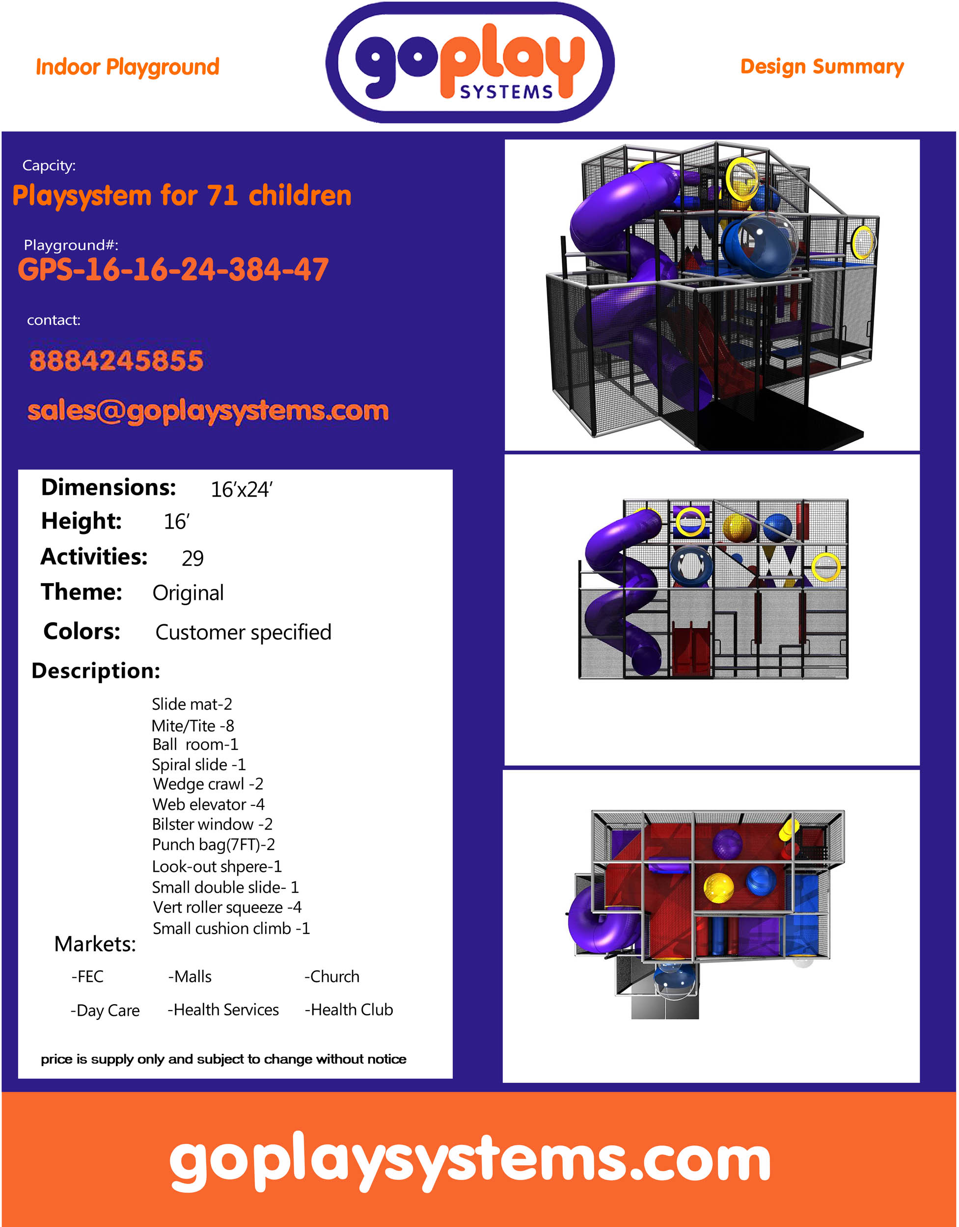 Indoor Playground GPS47 is a custom made indoor play system for children ages three to twelve. The soft playground measures 24 ft. wide by 16 ft. high and a length of 16 ft. The minimum room space required for this indoor playground is approximately 30 ft. room width with a 18 ft. ceiling and 22 ft. room length. Medium Size Indoor Playground.