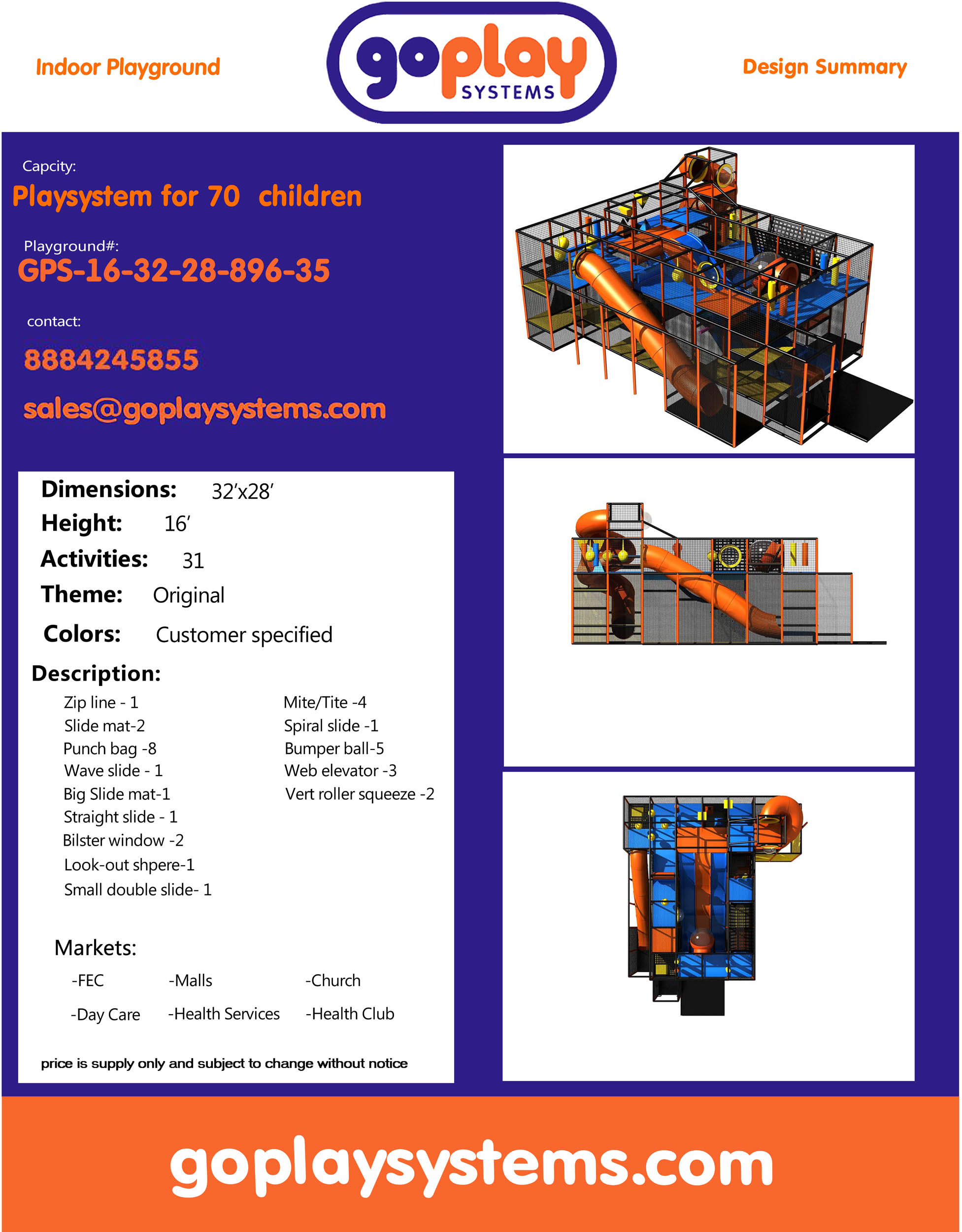 Indoor Playground GPS35 is a custom made indoor play system for children ages three to twelve. The soft playground measures 28 ft. wide by 16 ft. high and a length of 32 ft. The minimum room space required for this indoor playground is approximately 34 ft. room width with a 18 ft. ceiling and 38 ft. room length. Medium Size Indoor Playground.