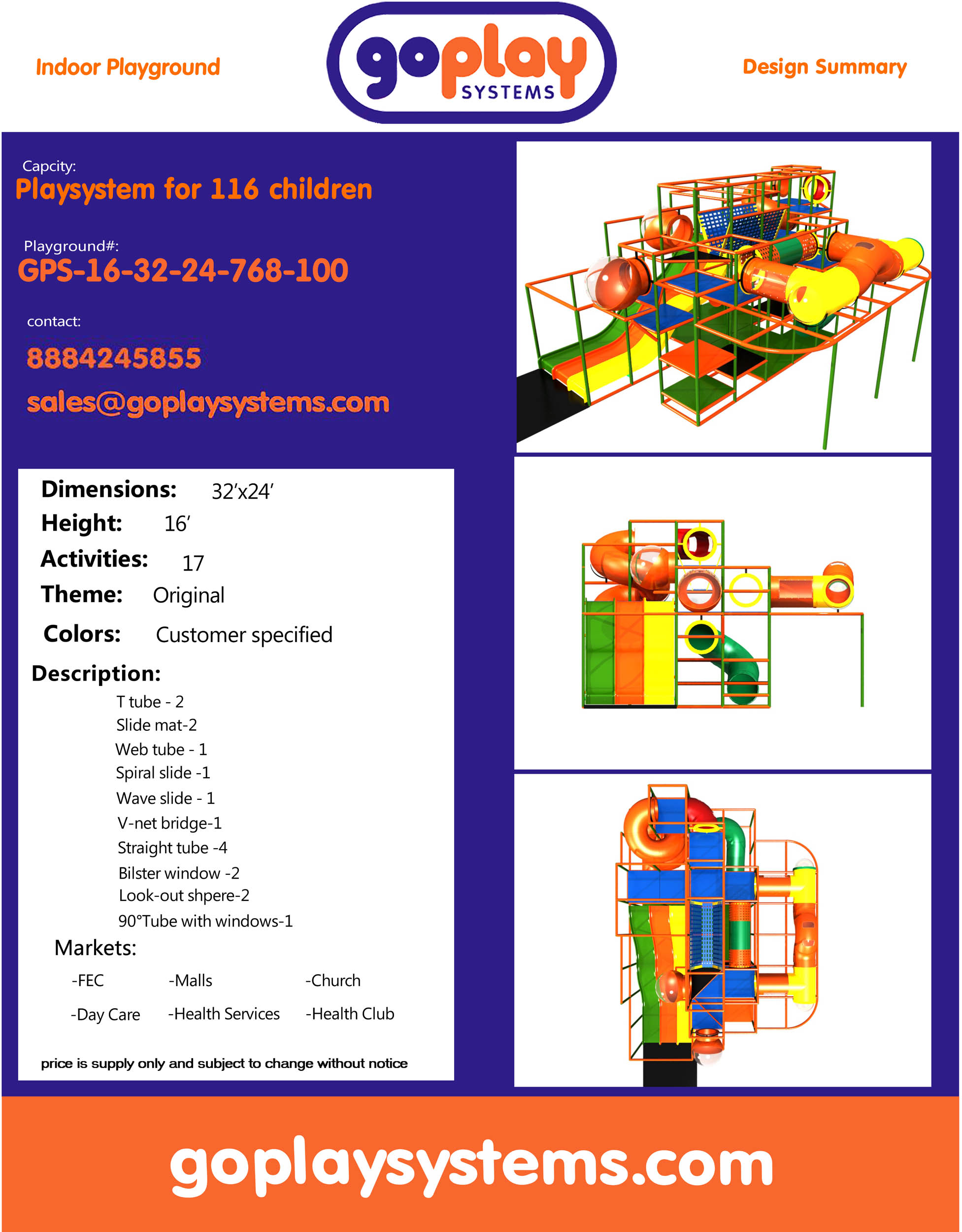 Indoor Playground GPS100 is a custom made indoor play system for children ages three to twelve. The soft playground measures 32 ft. wide by 16 ft. high and a length of 24 ft. The minimum room space required for this indoor playground is approximately 38 ft. room width with a 18 ft. ceiling and 30 ft. room length. Medium Size Indoor Playground.