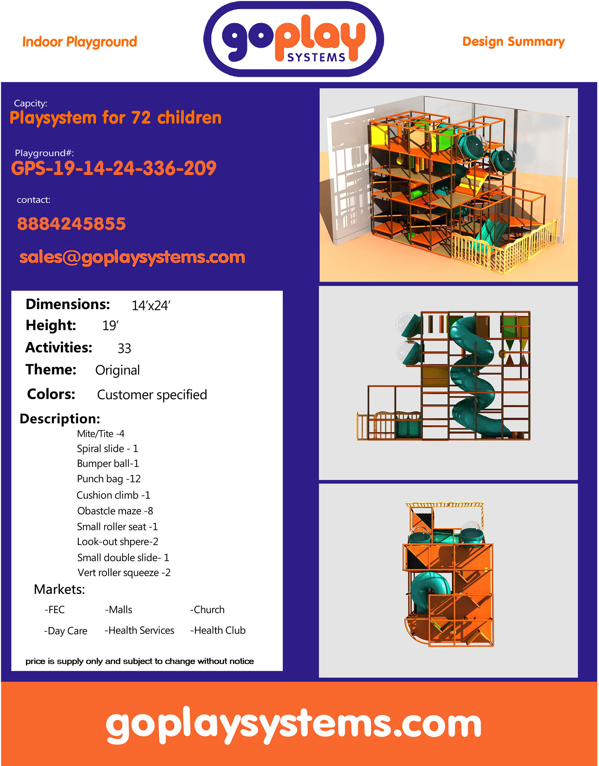 Indoor Playground GPS209 is a custom made indoor play system for children ages three to twelve. The soft playground measures 14 ft. wide by 19 ft. high and a length of 24 ft. The minimum room space required for this indoor playground is approximately 20 ft. room width with a 21 ft. ceiling and 30 ft. room length. Medium Size Indoor Playground. This playground is suitable to fit in a building or warehouse with a high ceiling.