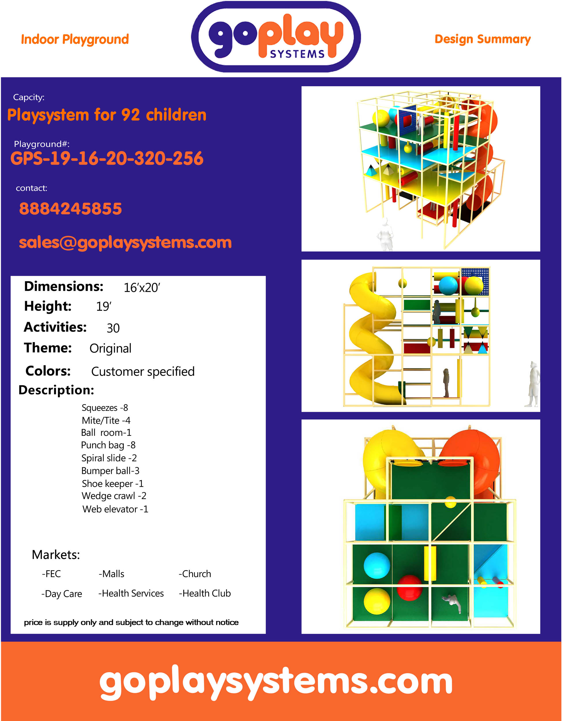 Indoor Playground GPS256 is a custom made indoor play system for children ages three to twelve. The soft playground measures 16 ft. wide by 19 ft. high and a length of 20 ft. The minimum room space required for this indoor playground is approximately 22 ft. room width with a 21 ft. ceiling and 26 ft. room length. Medium Size Indoor Playground. This playground is suitable to fit in a building or warehouse with a high ceiling.