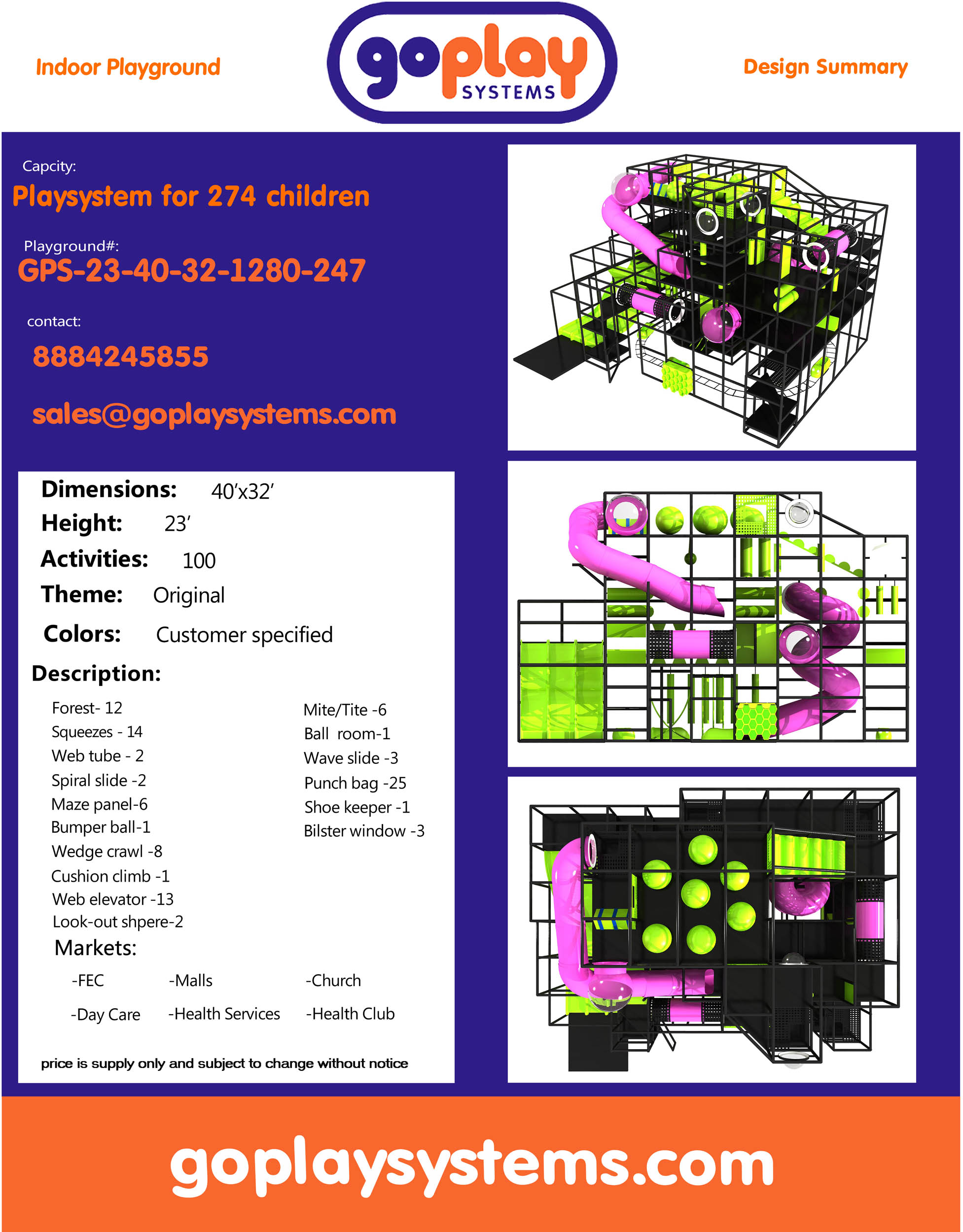Indoor Playground GPS247 is a custom made indoor softplay unit for children ages three to twelve.. The indoor playsystem measures 40 ft. wide by 23 ft. high and a length of 32 ft. The minimum room space required for this indoor playground is approximately 46 ft. room width with a 25 ft. ceiling and 38 ft. room length. Large Size Indoor Playground. This playground is suitable to fit in a building or warehouse with a high ceiling.