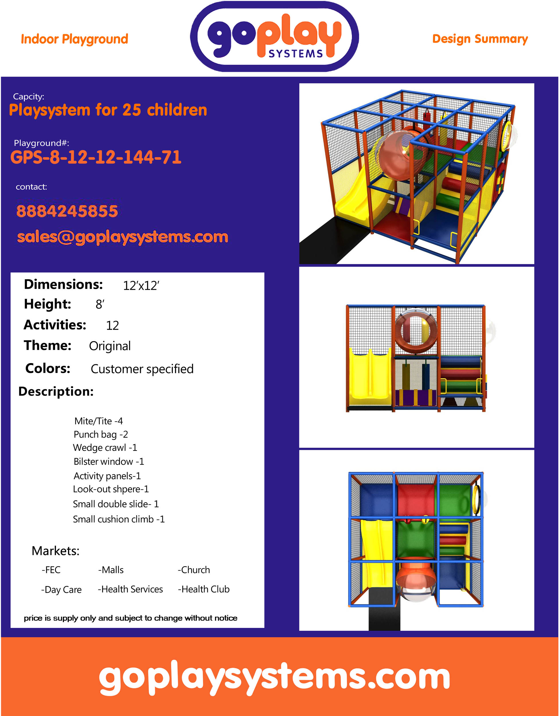 Indoor Playground GPS71 is a custom made indoor softplay unit for children ages three to twelve.. The indoor playsystem measures 12 ft. wide by 8 ft. high and a length of 12 ft. The minimum room space required for this indoor playground is approximately 18 ft. room width with a 10 ft. ceiling and 18 ft. room length. Small Size Indoor Playground.
