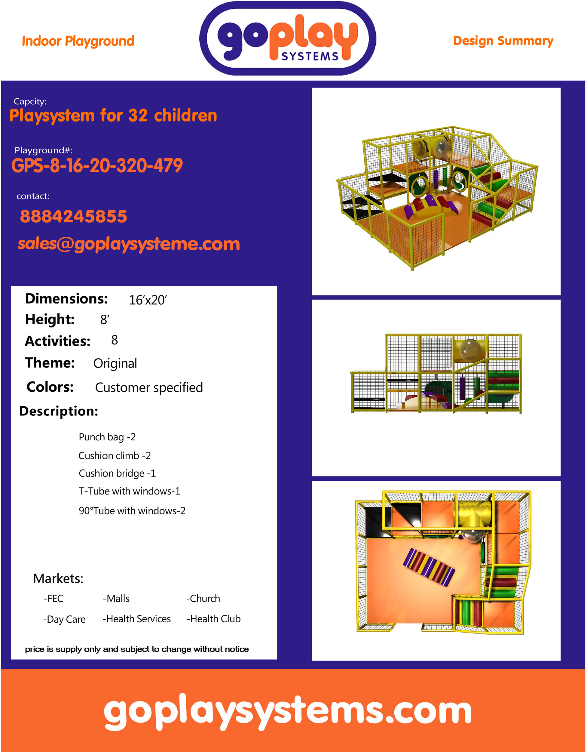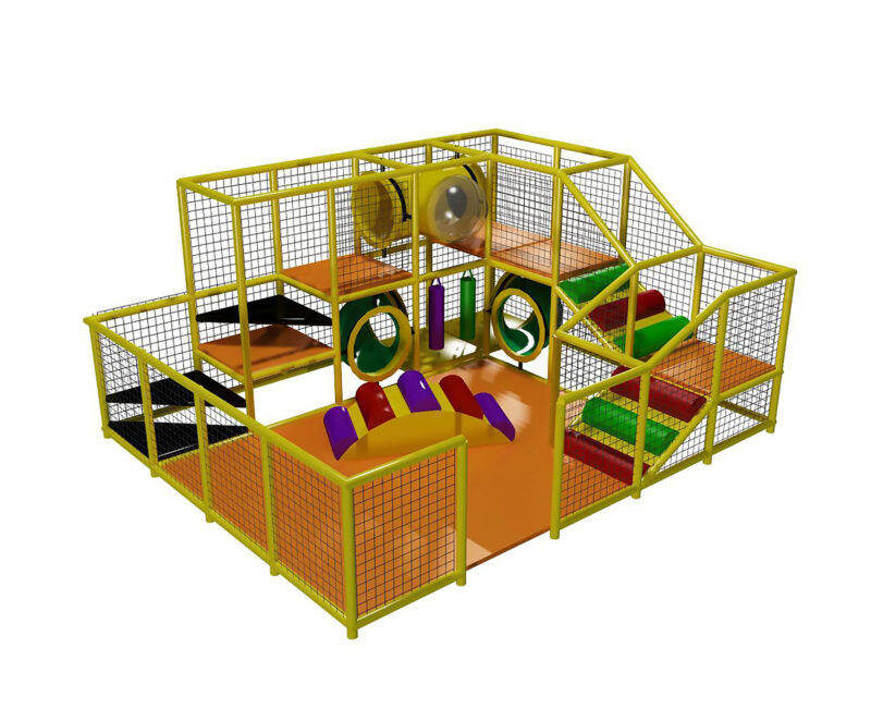 Indoor Playground GPS479 is a custom made indoor softplay unit for children ages three to twelve.. The indoor playsystem measures 16 ft. wide by 8 ft. high and a length of 20 ft. The minimum room space required for this indoor playground is approximately 22 ft. room width with a 10 ft. ceiling and 26 ft. room length. Small Size Indoor Playground.
