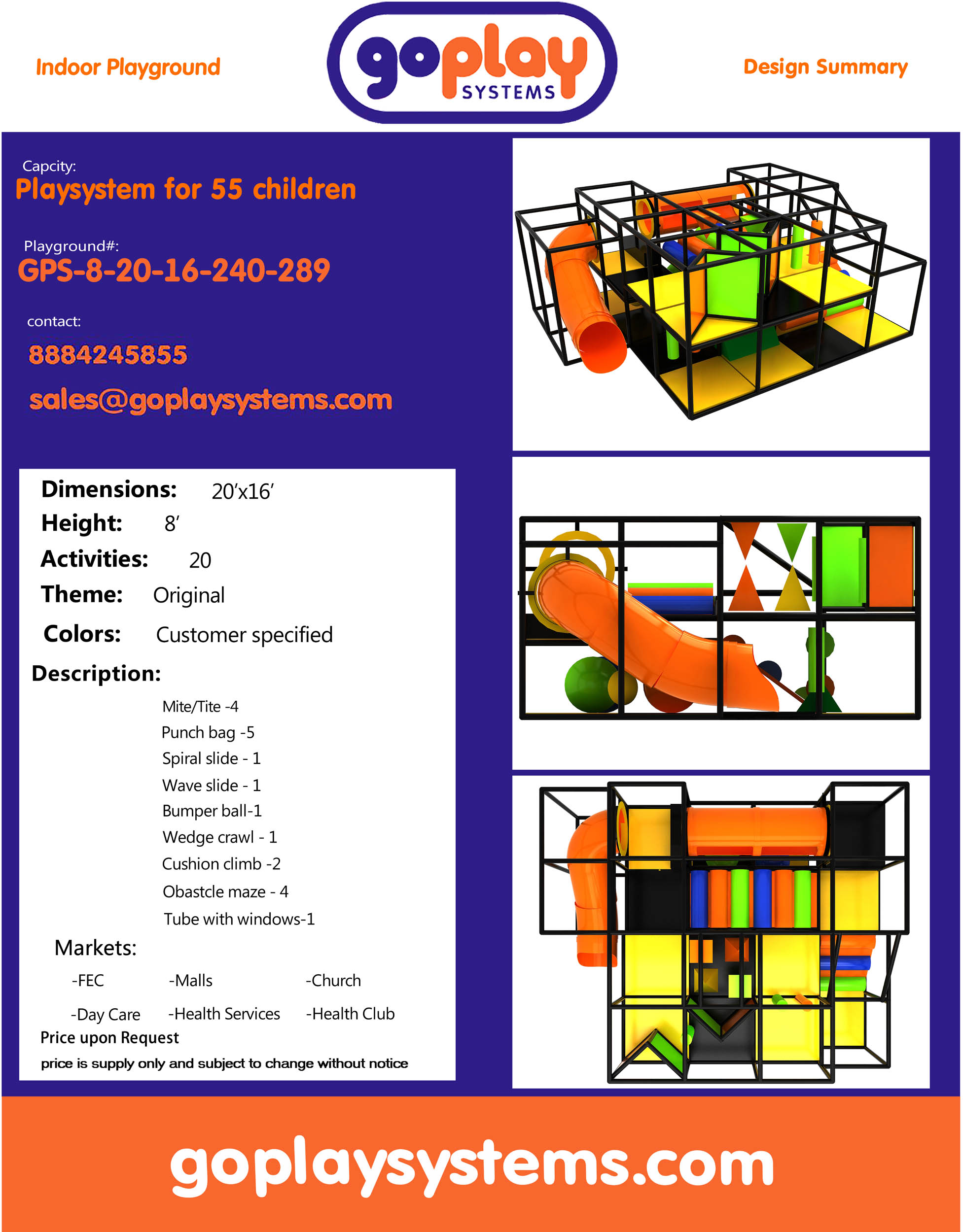 Indoor Playground GPS289 is a custom made indoor softplay unit for children ages three to twelve.. The indoor playsystem measures 20 ft. wide by 8 ft. high and a length of 16 ft. The minimum room space required for this indoor playground is approximately 26 ft. room width with a 10 ft. ceiling and 22 ft. room length. Small Size Indoor Playground.