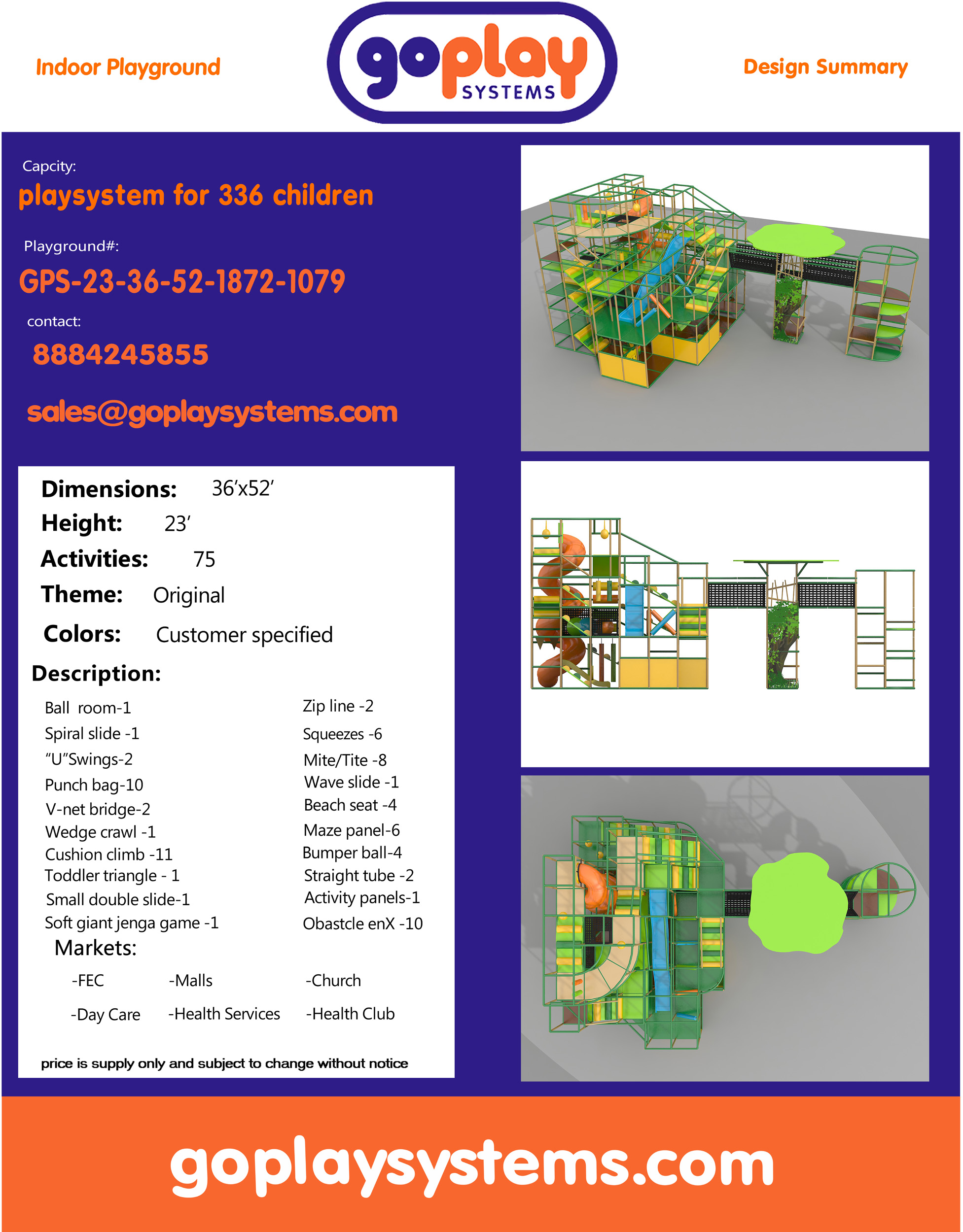 Indoor Playground GPS079 is a custom designed modular soft play system developed to safely accommodate children. The playground system measures 36 ft. wide by 23 ft. high and a length of 52 ft. The minimum indoor room space required for this playground is approximately 42 ft. room width with a 25 ft. ceiling and 58 ft. room length. Medium Size Indoor Playground.