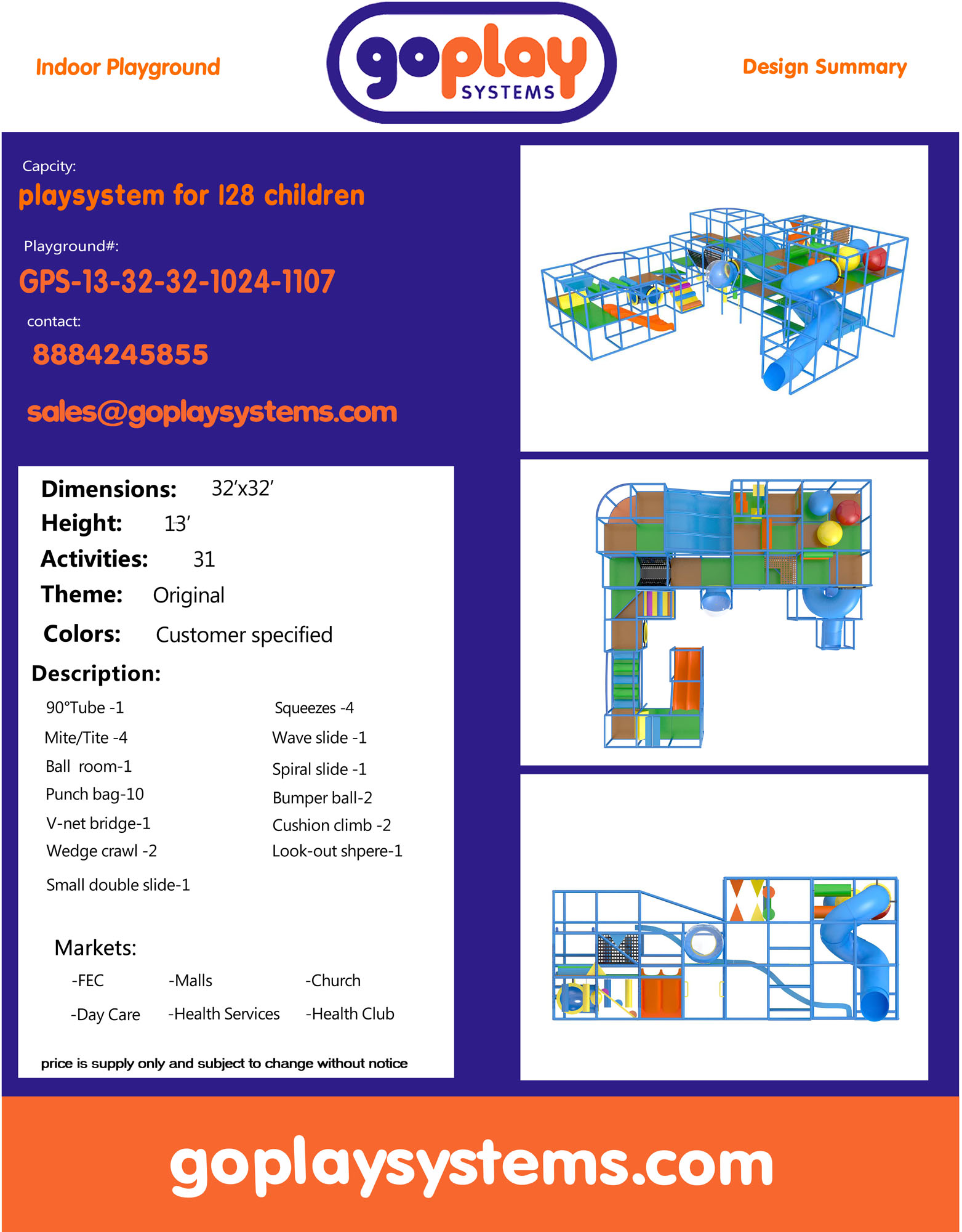 Indoor Playground GPS1107 79281.55 is a custom designed module soft play system. The playground system measures 13 ft. H x 32 ft. W x 32 ft.