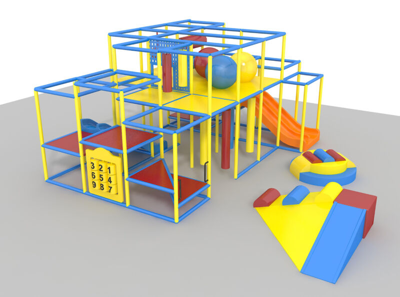 Indoor Playground GPS113 is a custom designed modular soft play system developed to safely accommodate children. The playground system measures 14 ft. wide by 10 ft. high and a length of 20 ft. The minimum indoor room space required for this playground is approximately 20 ft. room width with a 12 ft. ceiling and 26 ft. room length. Medium Size Indoor Playground.