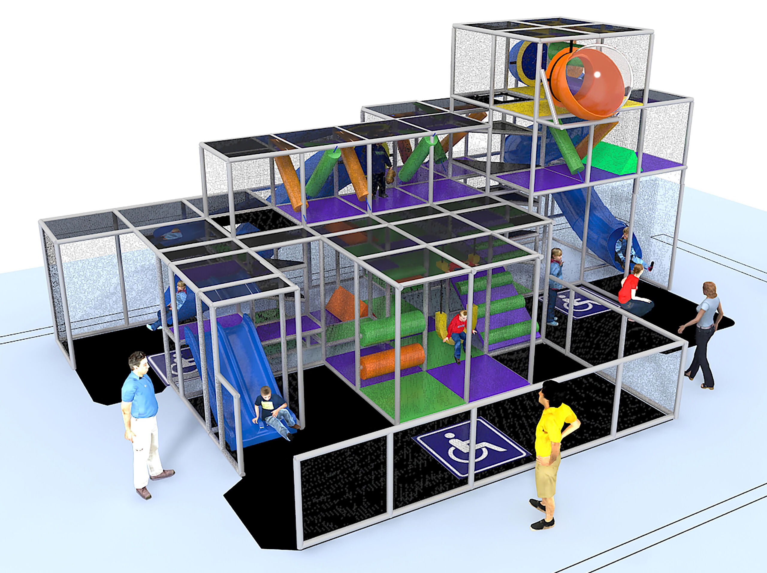 Indoor Playground GPS1123 is a custom designed module soft play system. The playground system measures 16 ft. H x 36 ft. W x 24 ft.