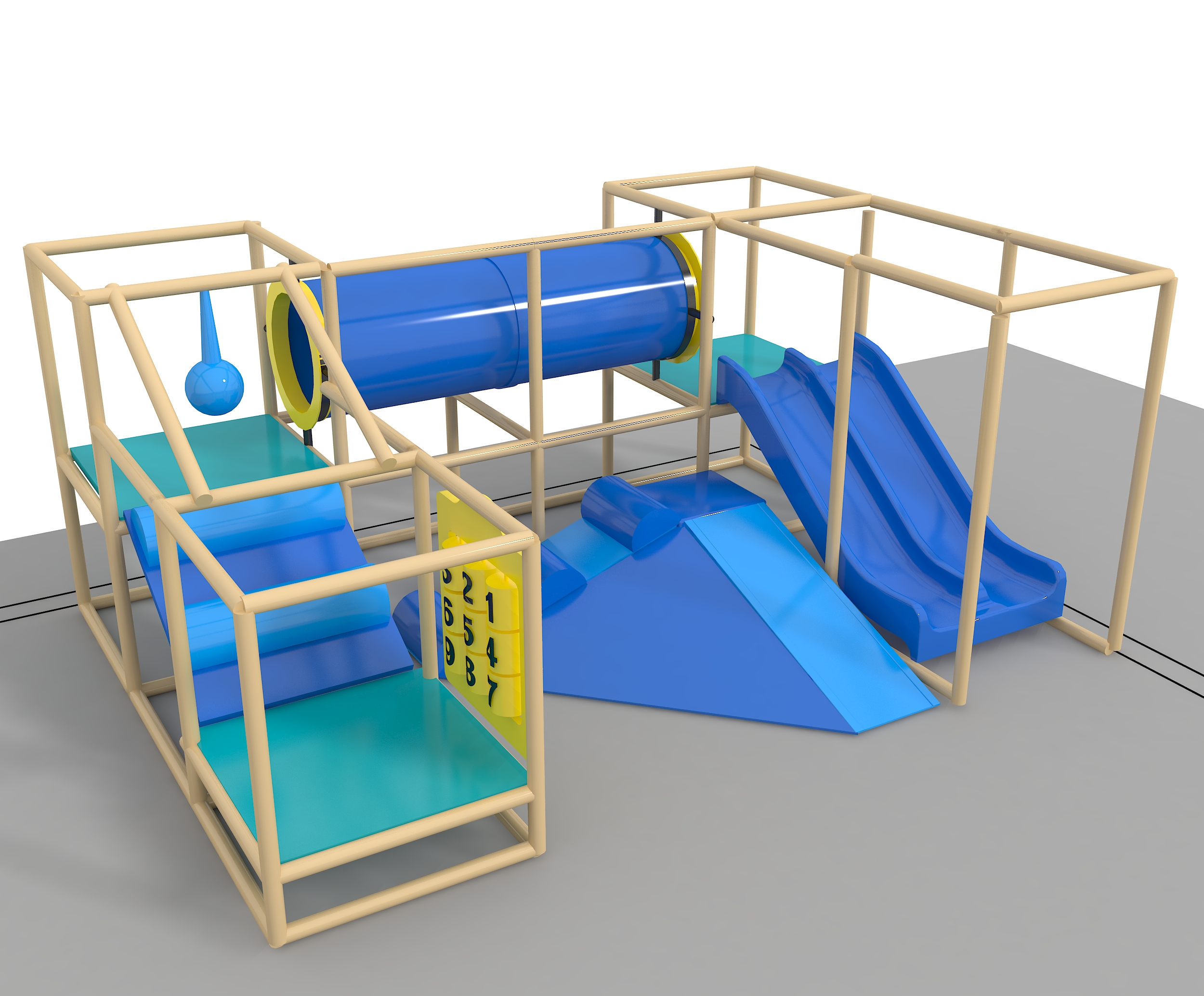 Indoor Playground GPS1196 is a custom indoor playsystem for children three to twelve years of age. The softplay unit measures 16 ft. wide by 8 ft. high and a length of 12 ft. The minimum room space required for this children’s play equipment is approximately 22 ft. room width with a 10 ft. ceiling and 18 ft. room length. Total area: 192 sq ft. Small Size Indoor Playground.