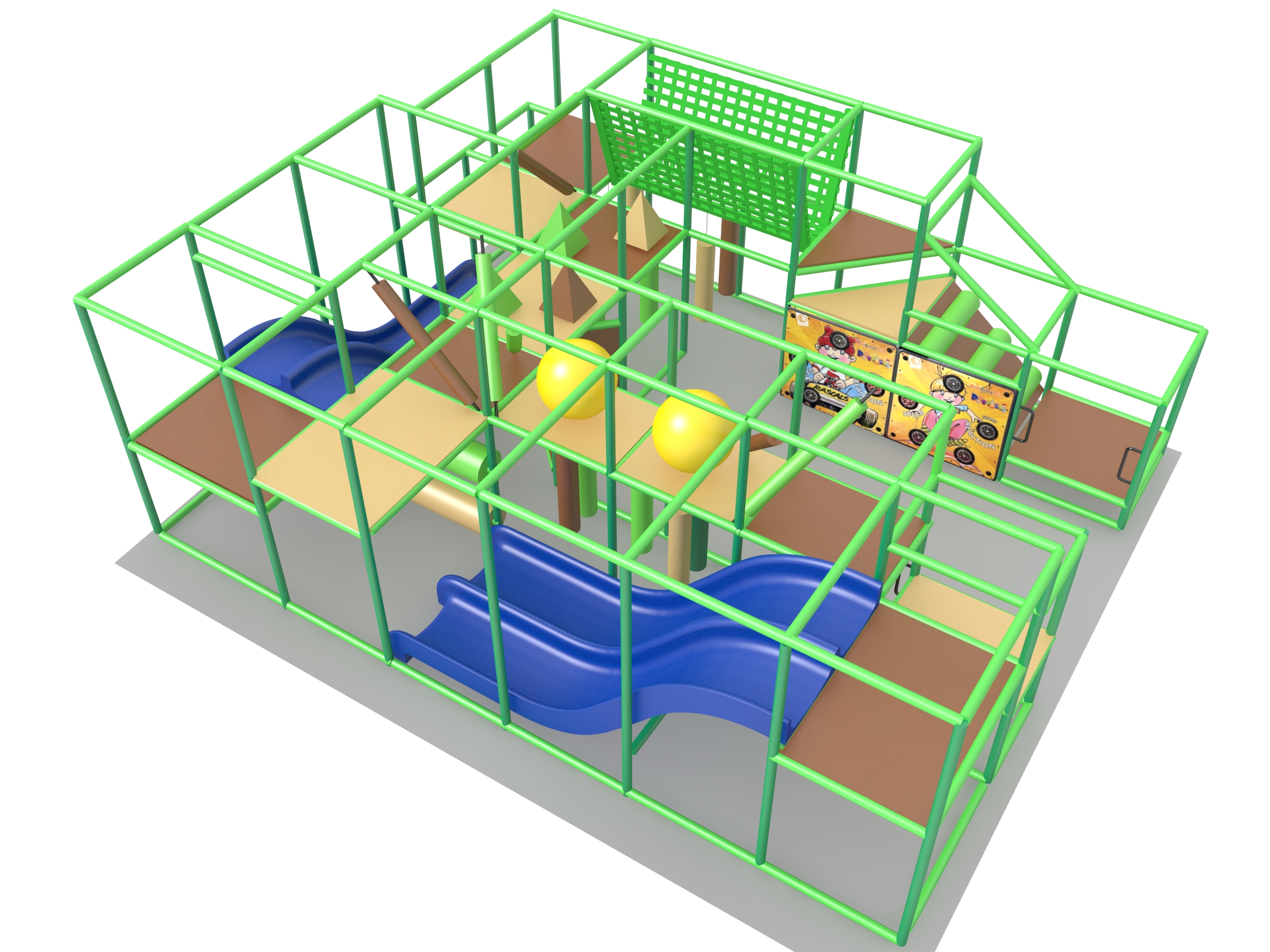 Indoor Playground GPS1272 is a custom indoor playsystem for children three to twelve years of age. The softplay unit measures 20 ft. wide by 9 ft. high and a length of 25 ft. The minimum room space required for this children’s play equipment is approximately 26 ft. room width with a 11 ft. ceiling and 31 ft. room length. Total area: 500 sq ft. Medium Size Indoor Playground.