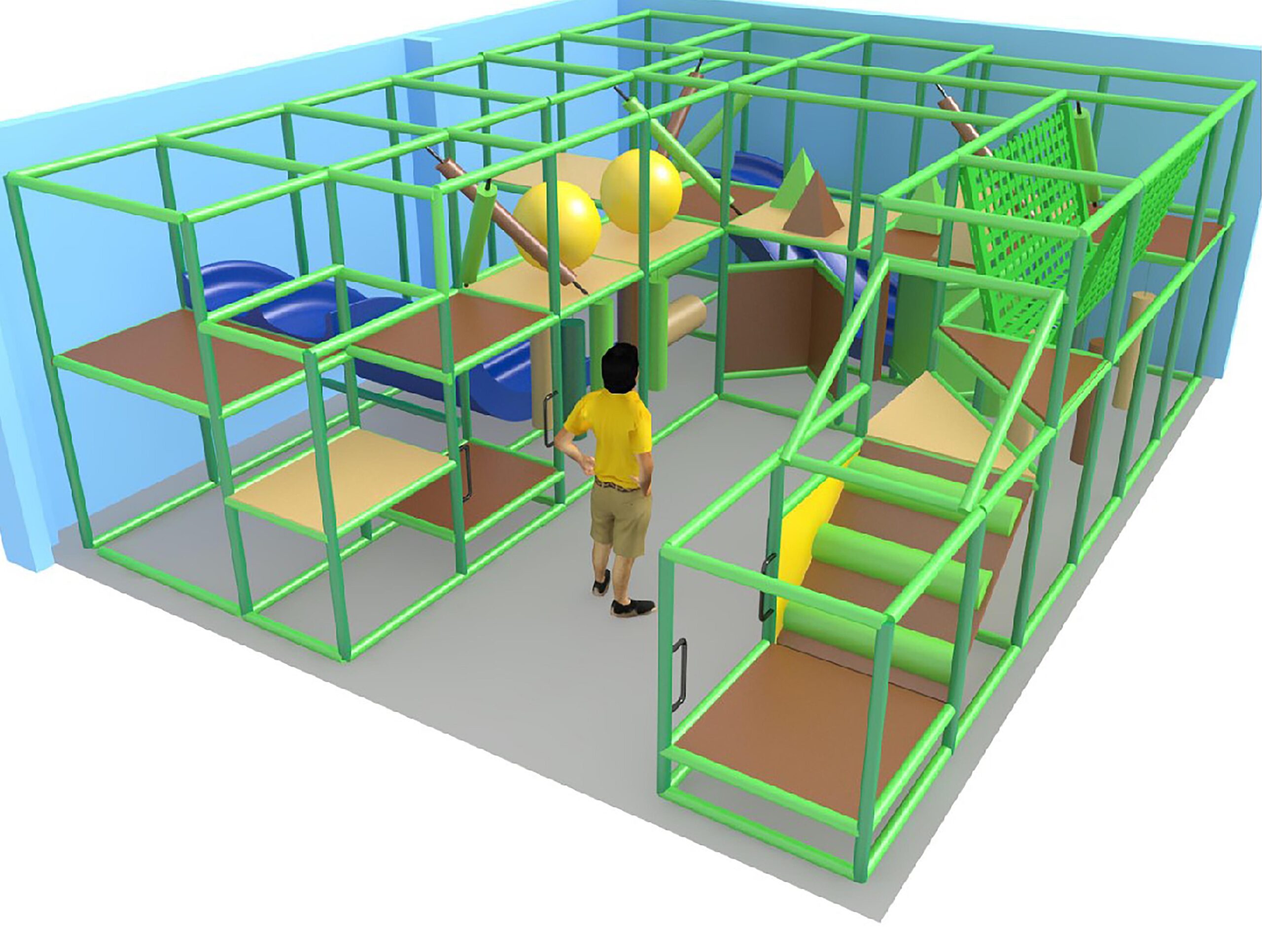 Indoor Playground GPS1272 is a custom indoor playsystem for children three to twelve years of age. The softplay unit measures 25 ft. wide by 9 ft. high and a length of 20 ft. The minimum room space required for this children’s play equipment is approximately 31 ft. room width with a 11 ft. ceiling and 26 ft. room length. Total area: 518 sq ft. Medium Size Indoor Playground.