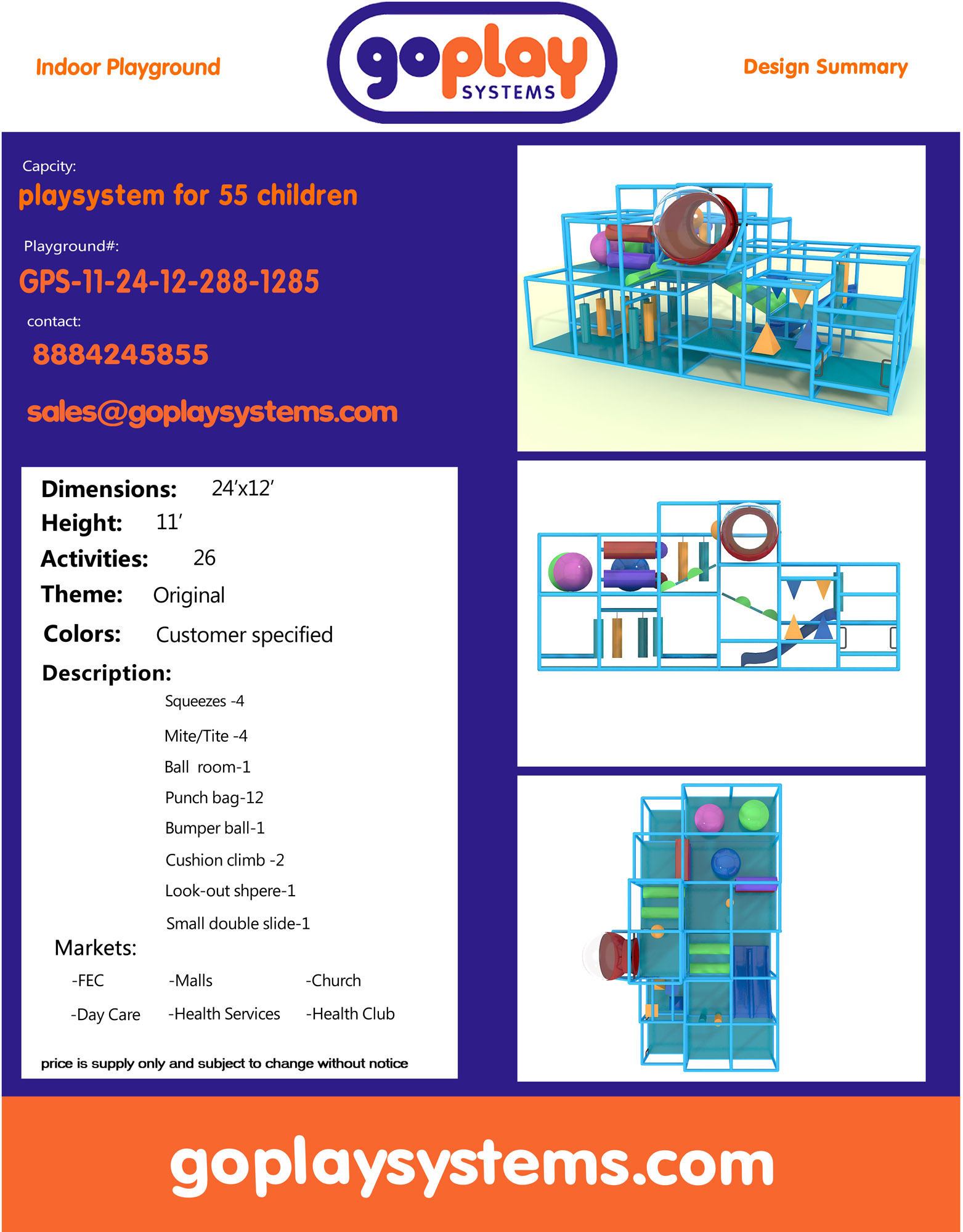 Indoor Playground GPS1285 is a custom indoor playsystem for children three to twelve years of age. The softplay unit measures 24 ft. wide by 11 ft. high and a length of 12 ft. The minimum room space required for this children’s play equipment is approximately 30 ft. room width with a 13 ft. ceiling and 18 ft. room length. Total area: 288 sq ft. Medium Size Indoor Playground.