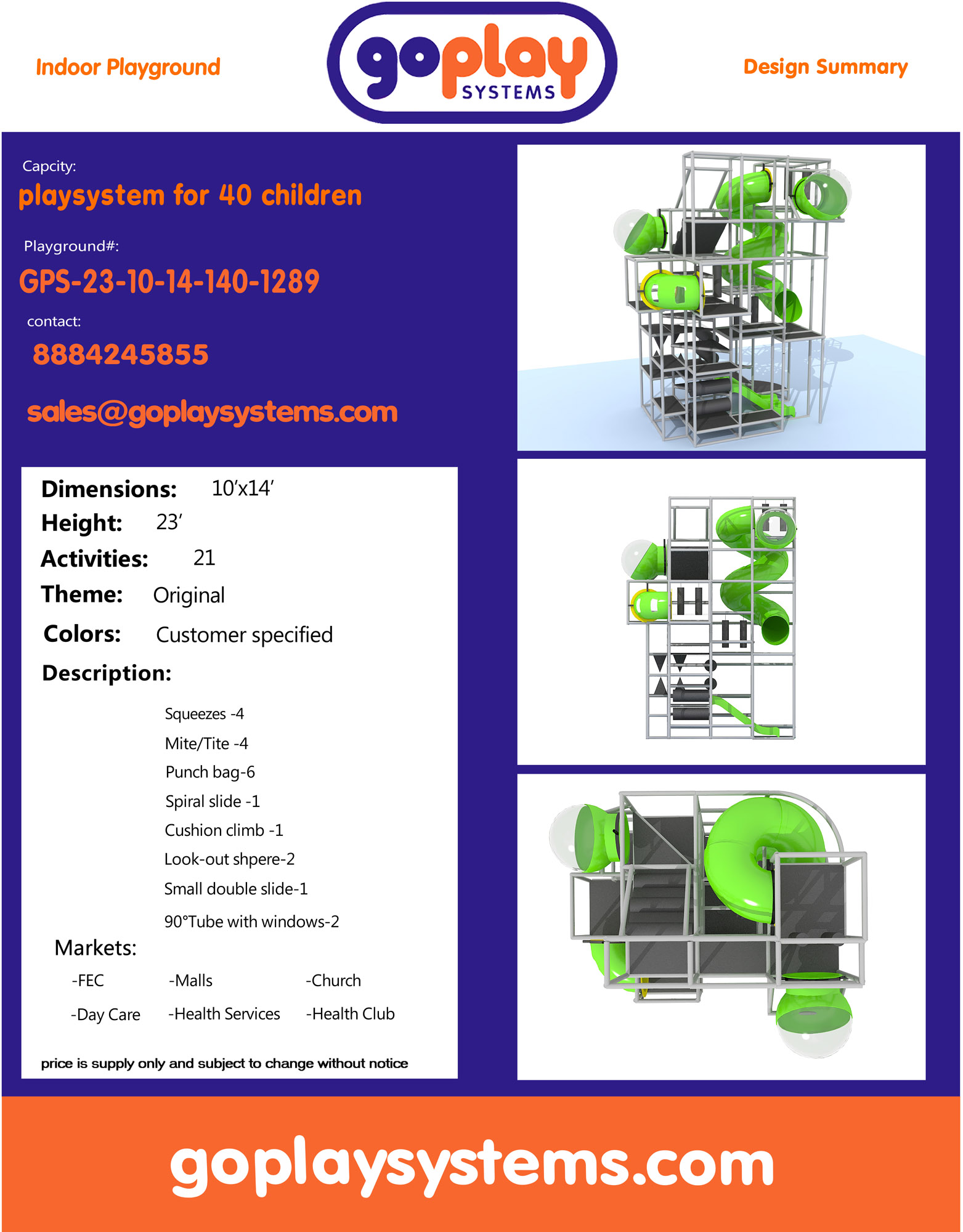 Indoor Playground GPS1289 is a custom indoor playsystem for children three to twelve years of age. The softplay unit measures 10 ft. wide by 23 ft. high and a length of 14 ft. The minimum room space required for this children’s play equipment is approximately 16 ft. room width with a 25 ft. ceiling and 20 ft. room length. Total area: 140 sq ft. Medium Size Indoor Playground.