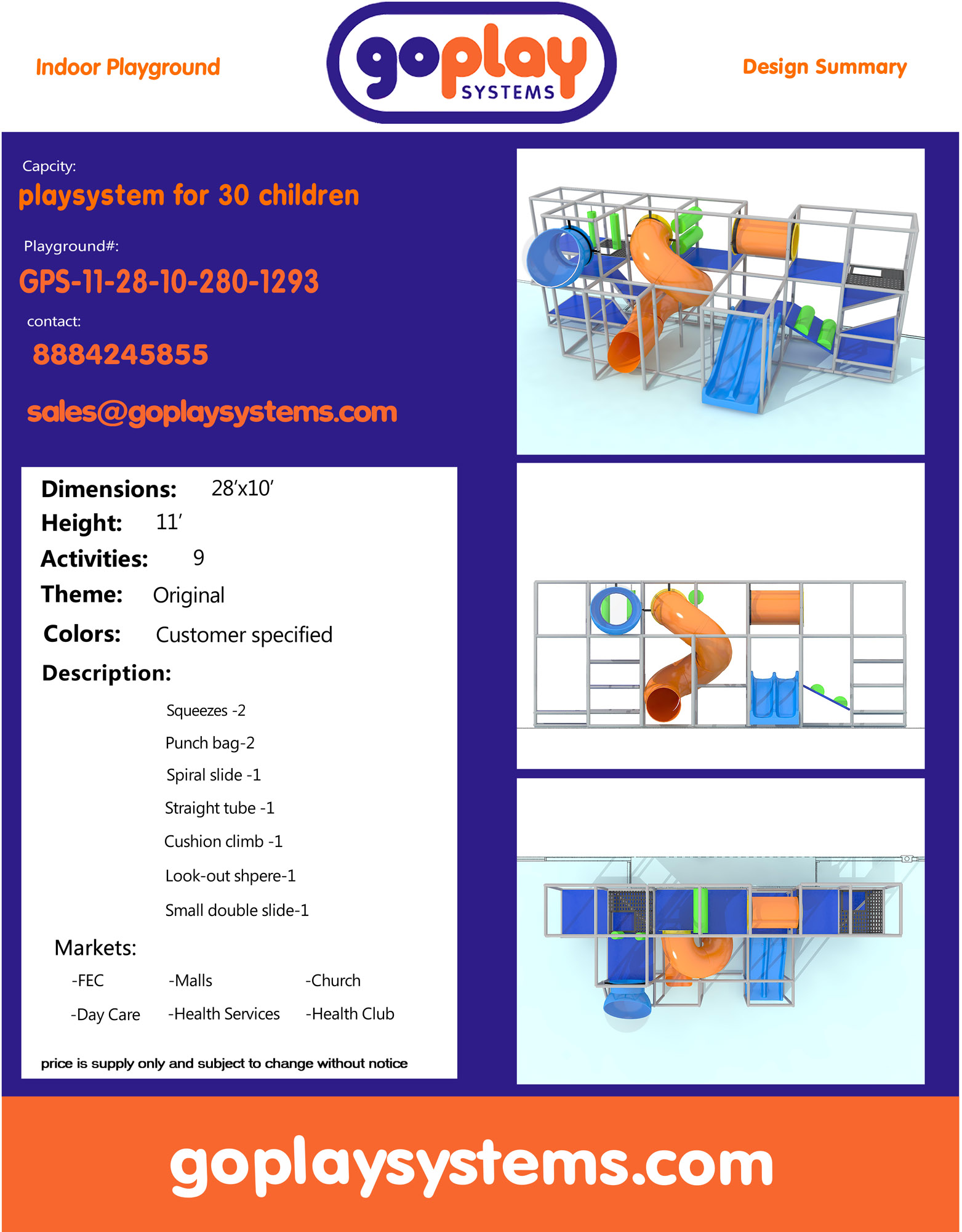 Indoor Playground GPS1293 is a custom indoor playsystem for children three to twelve years of age. The softplay unit measures 28 ft. wide by 11 ft. high and a length of 10 ft. The minimum room space required for this children’s play equipment is approximately 34 ft. room width with a 13 ft. ceiling and 16 ft. room length. Total area: 280 sq ft. Medium Size Indoor Playground.